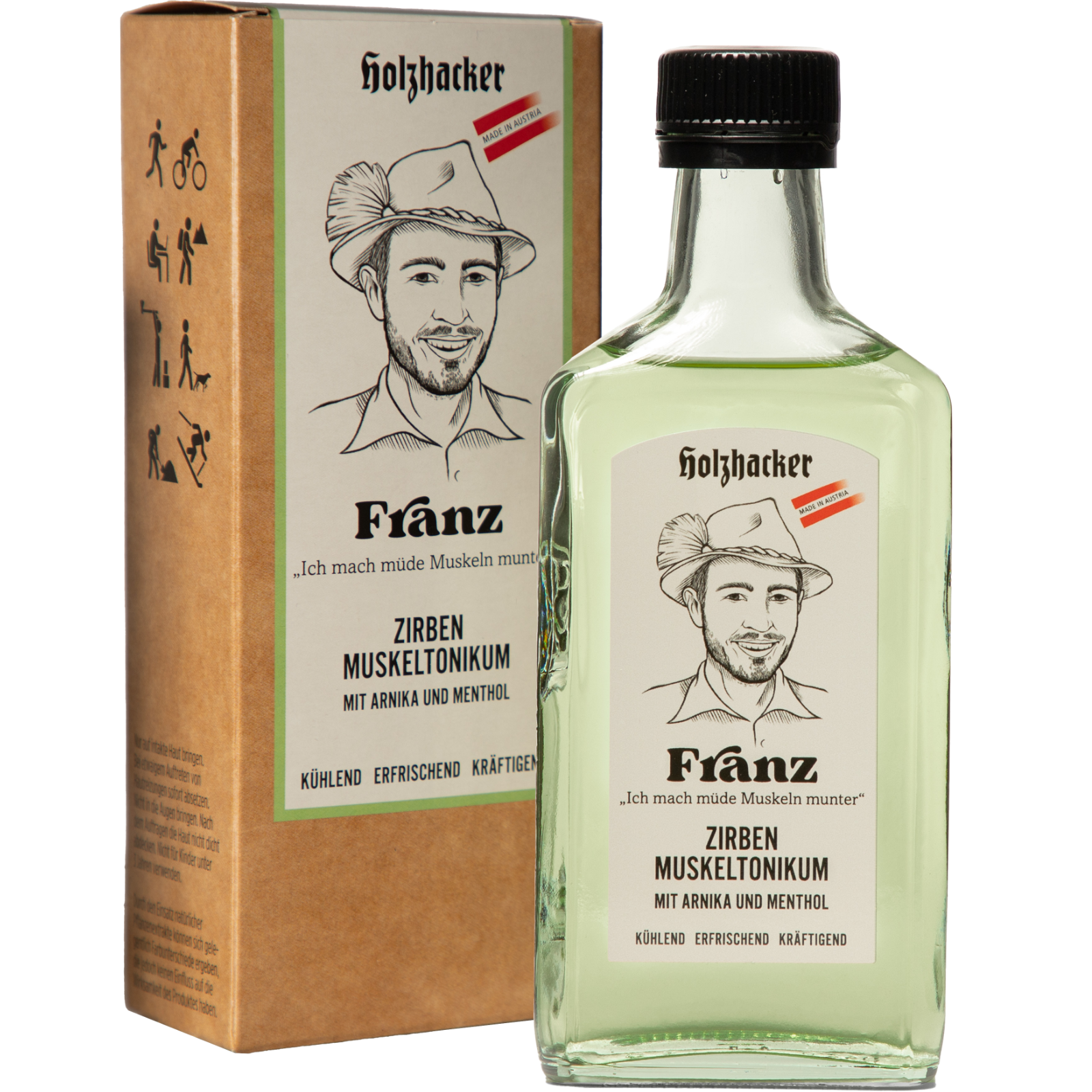 Dieses einzigartige Tonikum bietet nicht nur eine intensive Belebung der Muskulatur, sondern auch einen erfrischenden Kick nach der Belastung. Das Zirben - Muskeltonikum Franz ist die perfekte Vorbereitung auf eine intensive Belastung und danach eine willkommene Erfrischung für müde Muskeln. Das enthaltene Zirbenöl fördert die Durchblutung und verleiht ein belebendes Gefühl. Direkt nach der Anstrengung angewendet, versorgt es die Muskulatur mit einem erfrischenden Kick und hilft bei Verspannungen. Diese einzigartige Formel wurde entwickelt, um die Muskeln zu kräftigen, zu regenerieren und ihnen die Pflege zu bieten, die sie verdienen. Franz ist eine Geheimwaffe gegen müde Muskeln und Muskelverhärtungen.