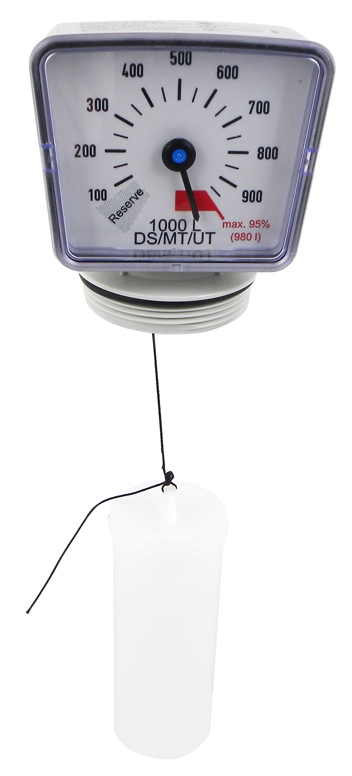 Anzeige, drehbar, mit 2 Zoll Außengewinde. Die Anzeige zeigt bei einer Tiefe von 125 cm den Stand Null an = Tanktiefe!