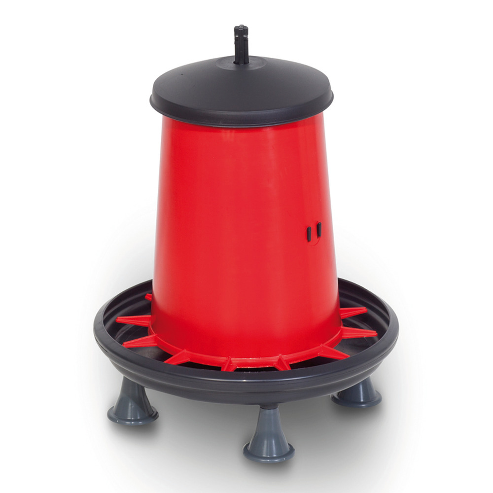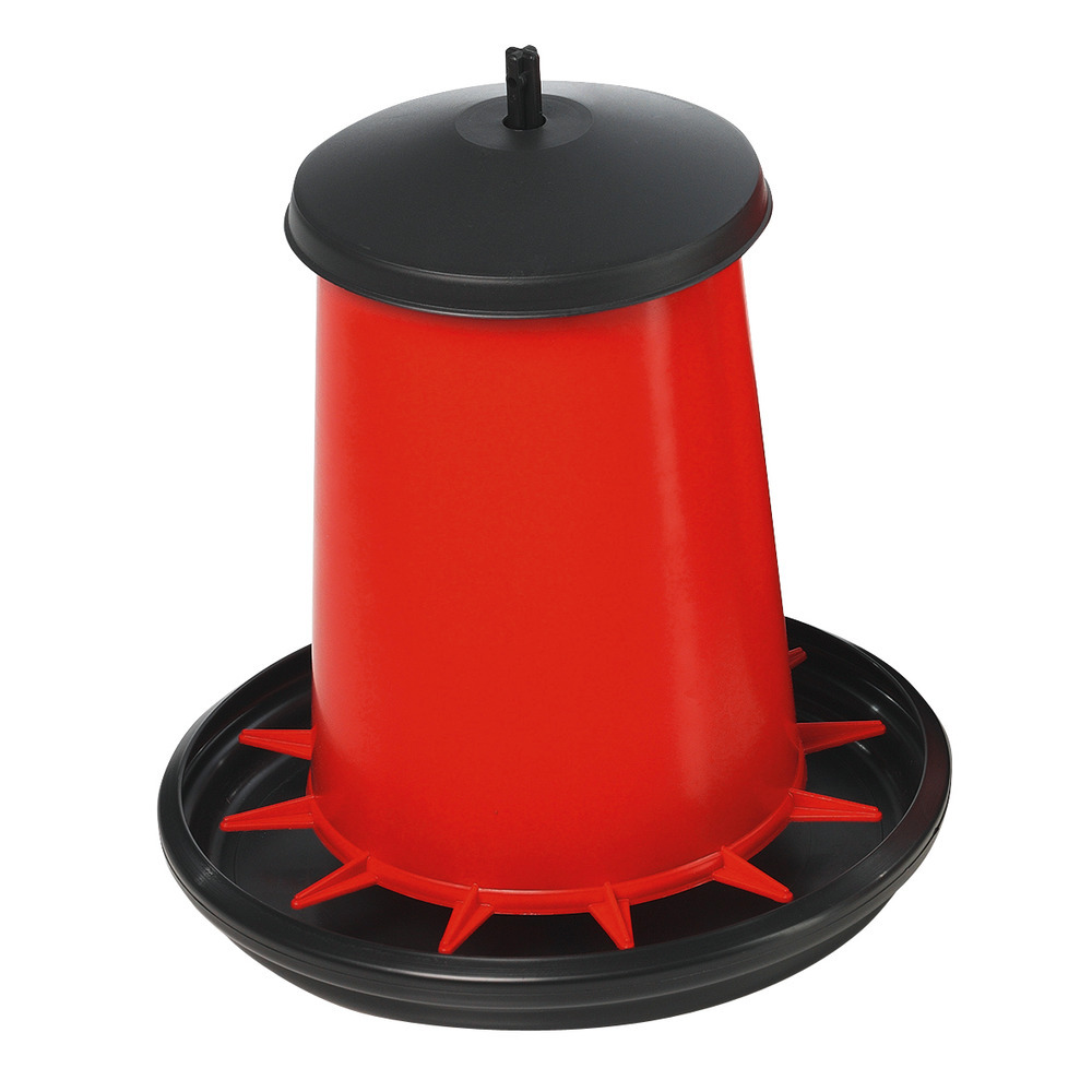 Stabiler Kunststofffutterautomat mit Deckel, bei dem eine stufenlose Futterhöheneinstellung möglich ist. Auch zum Aufhängen geeignet! Der abgerundete Tellerrand verringert die Futterverschwendung. Lieferung OHNE Füße (separat erhältlich, Best.Nr. 104350).