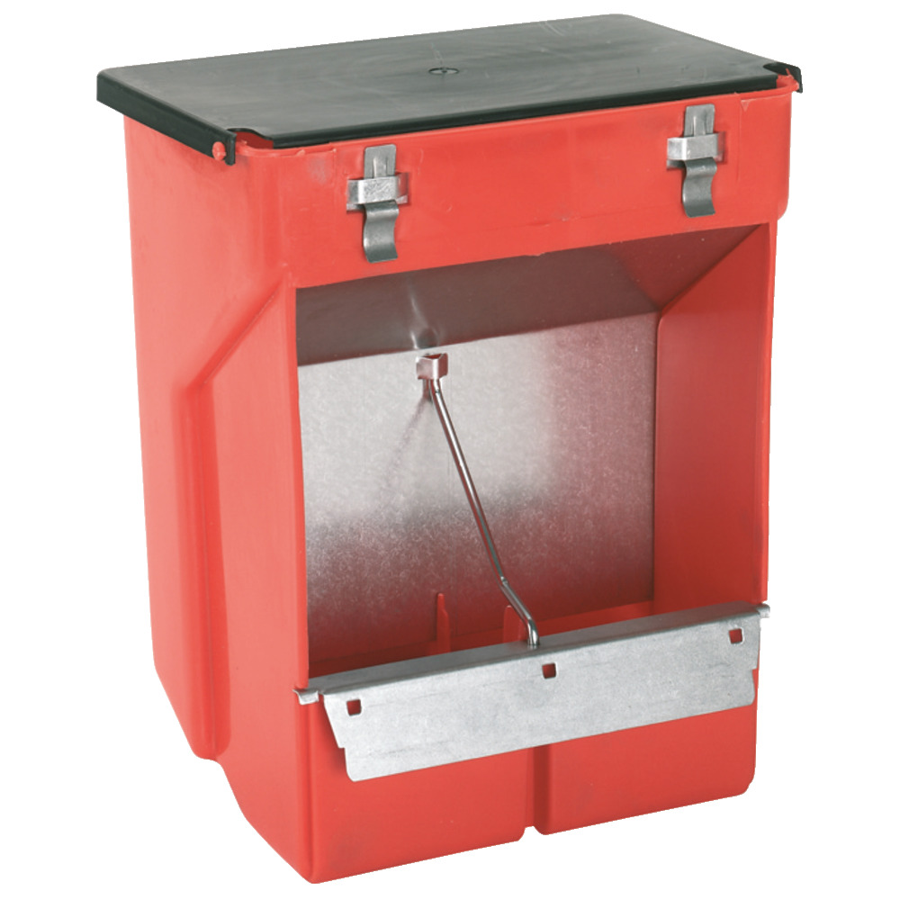 Aus Kunststoff, mit Nageschutz aus verzinktem Metall. Durch einen siebähnlichen Boden im Futterautomat haben die Tiere immer staubfreies Futter zur Verfügung. Kein Platzverlust im Stall, von außen anzubringen und zu befüllen. Mit Absperrmechanismus, inkl. Abdeckung. Inhalt 3,5 l