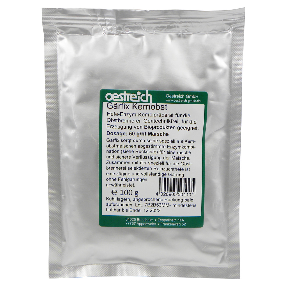 Das Hefe-EnzympräparatGärfix Kernobstsorgt durch seine speziell auf Kernobst abgestimmte Enzymkombination für eine sichere Verflüssigungvon Kernobstmaischen. Die für den Einsatz in der Obstbrennerei optimierte Reinzuchthefe gewährleistet eine zügige, vollständige Gärung für aromastarke Brände ohne Fehlgärung.