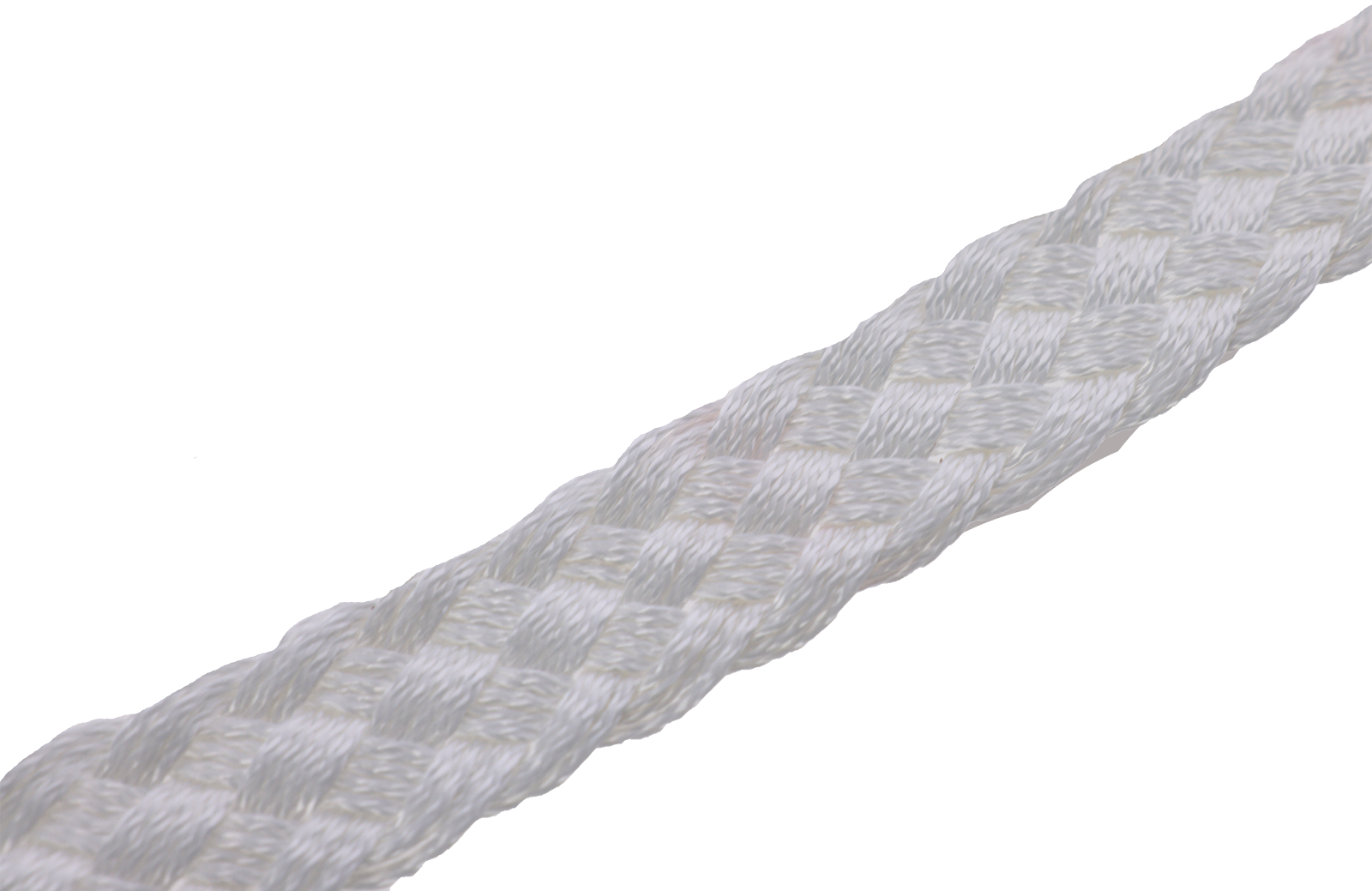Weißer Geburtsstrick aus Perlon, flach geflochten mit 2 Ösen. Länge 125 cm