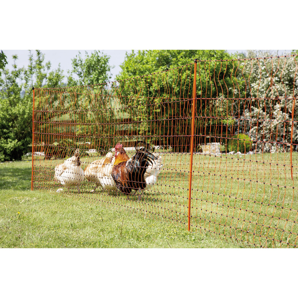 Mit verstärkter Oberlitze, besonders geringe Maschenweite im unteren Bereich des Netzes (5,9 cm).Inkl. 15 standfesten Kunststoffpfählen mit verzinkter Bodenspitze (Doppelspitze).