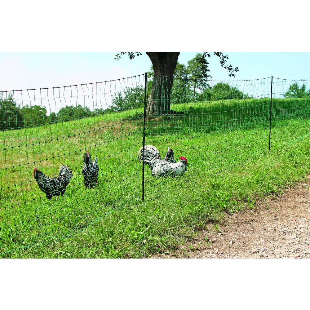 Mit verstärkter Oberlitze, besonders geringe Maschenweite im unteren Bereich des Netzes (5,9 cm).Stabile Kunststoffpfähle mit verzinkter Doppelspitze.