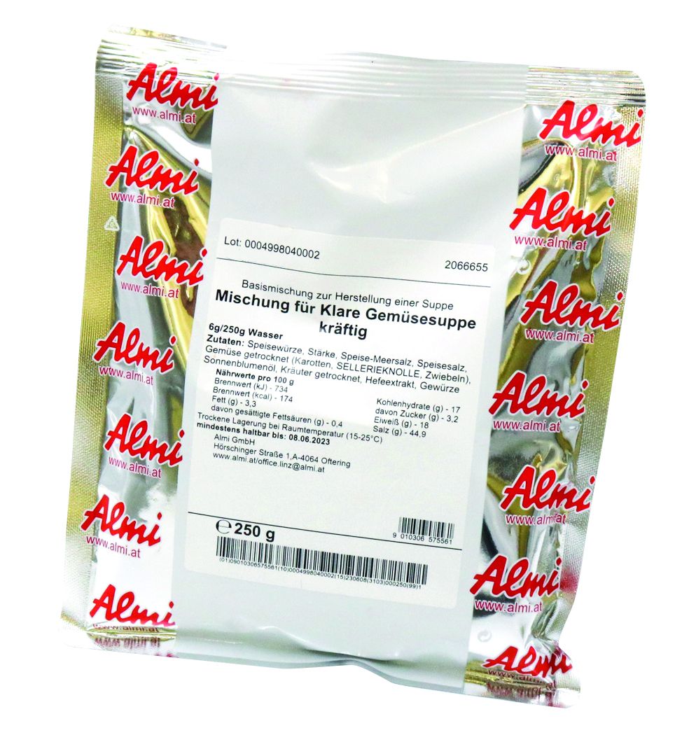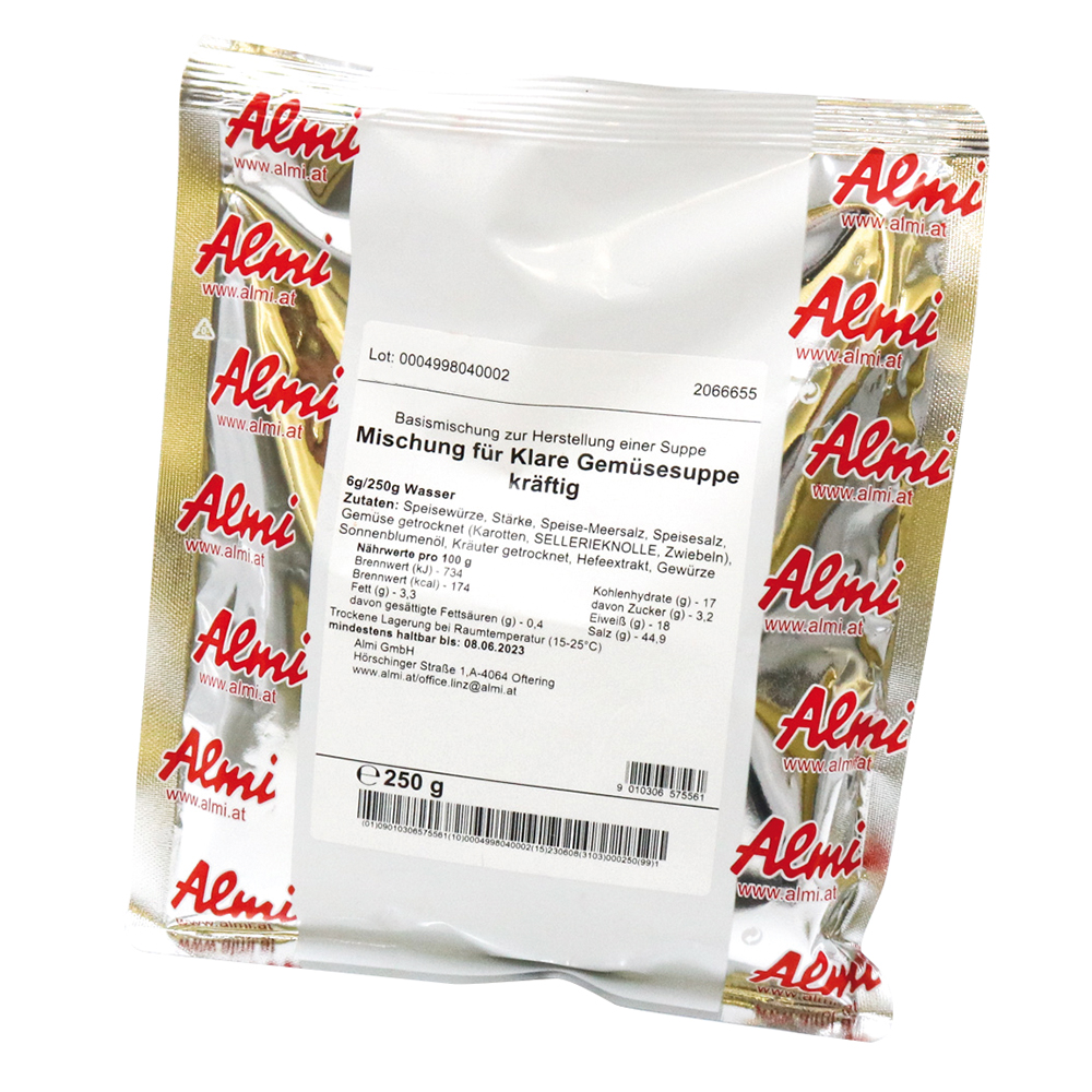 Fertigmischung für klare, kräftige Gemüsebrühe. Inhalt 250 g. Zugabeemfpehlung 6 g / 250 ml Wasser.