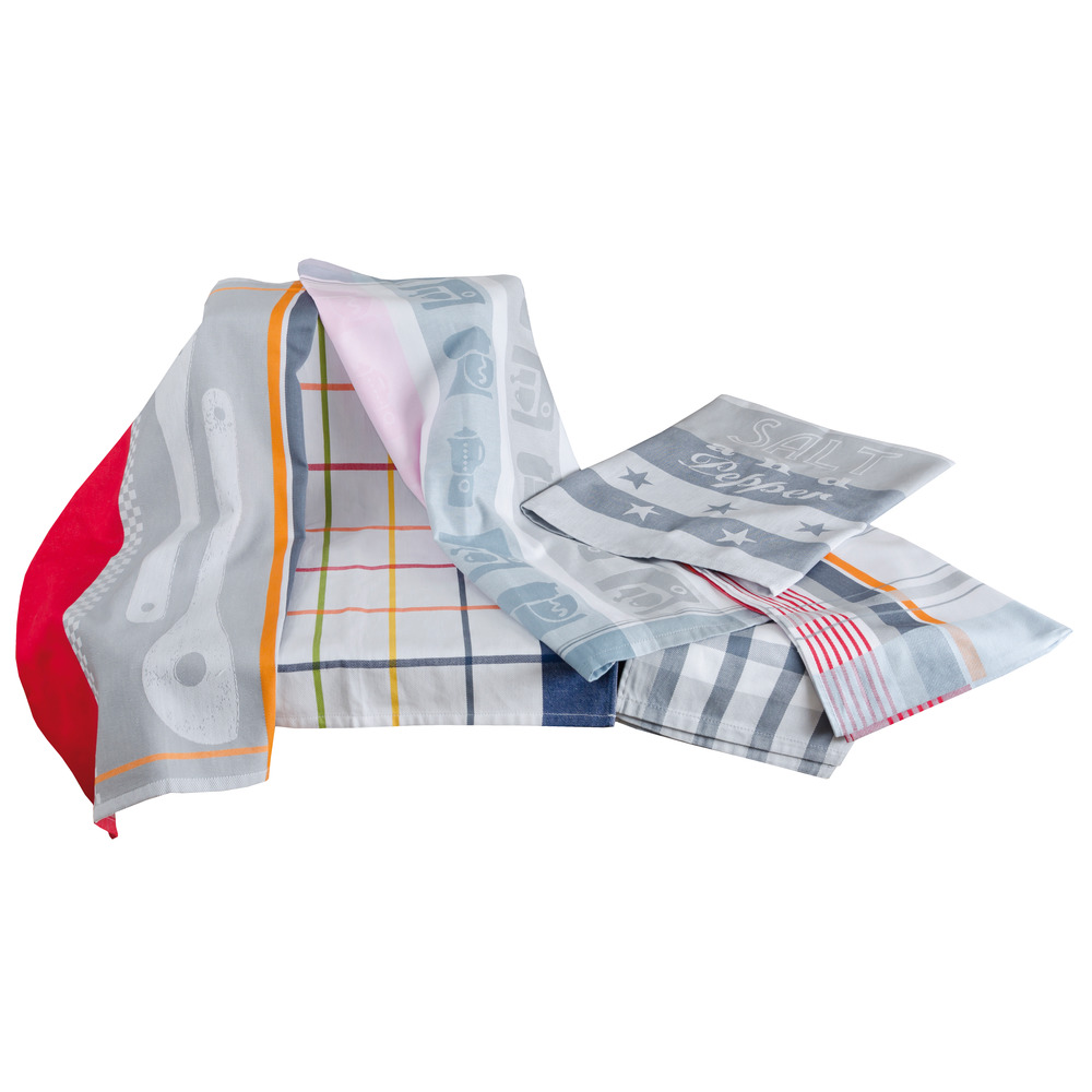 Schnell trockende Geschirrtücher aus 100 % Mako-Baumwolle. Verschiedene Designs sortiert und bei 60°C waschbar. Maße: 50x70cm.
