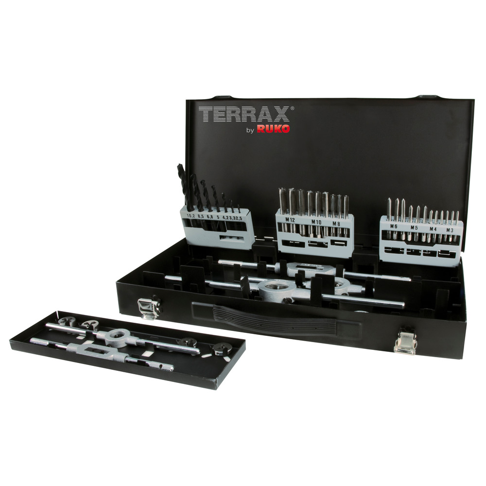 Hochwertiger 44-teiliger HSS Gewindeschneid-Satz aus dem Haus Terrax by Ruko von M3-M12 inkl. aller erforderlichen Schneideisen, Schneideisenhalter, Spiralbohrer, Wendeisen, einem Schraubendreher und einer Gewindeschablone. Verpackt in praktischer Stahlblech-Aufbewahrungskassette.