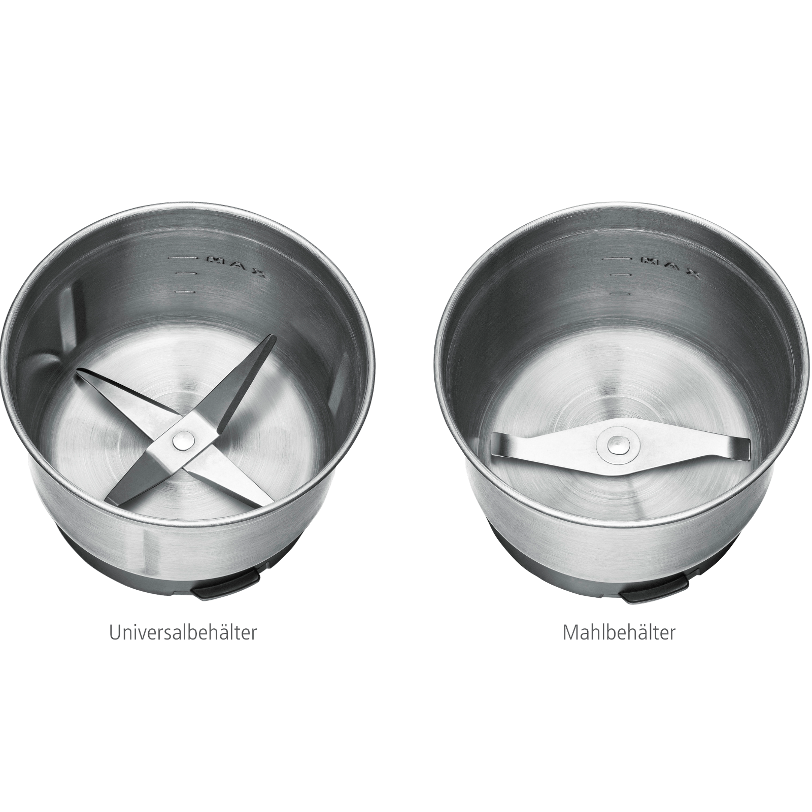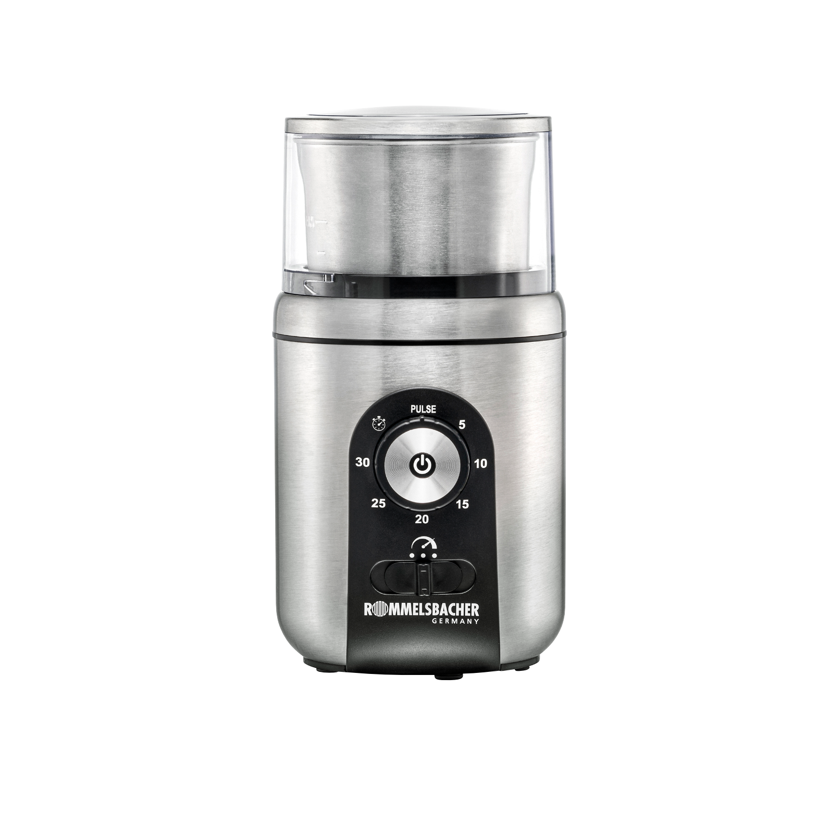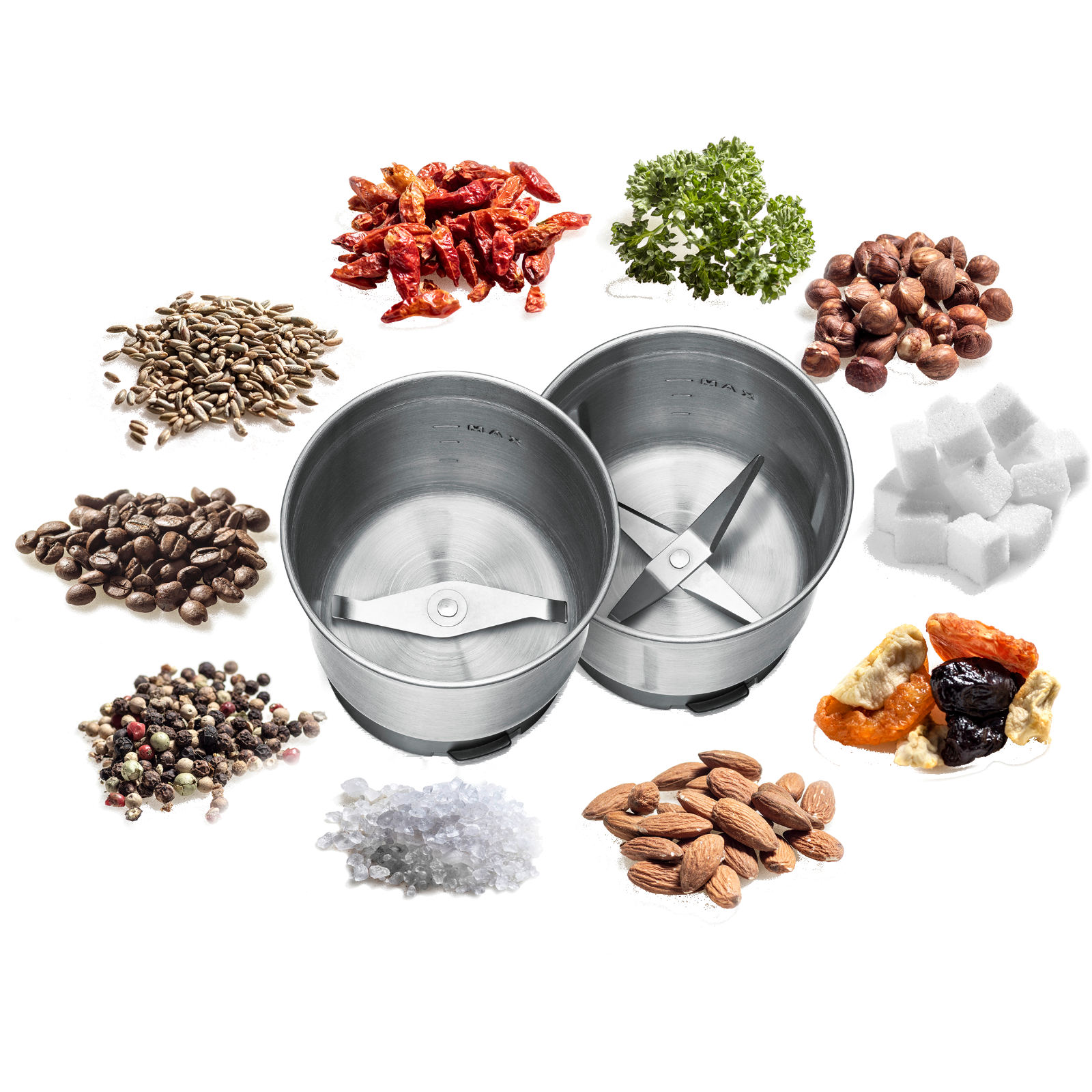 Im Mahlbehälter stellt man frisch gemahlenes Kaffeepulver her und zermahlt im Nu trockene Gewürze wie Pfefferkörner, Koriander und Kümmel.Auch lassen sich darin Salz oder Zucker fein pulverisieren. Im Universalbehälter werden frische Kräuter zerkleinert und Pesto oder Rubs zum Grillen zubereitet.Für den perfekten Mahlvorgang lassen sich Zeit und Drehzahl in mehreren Stufen einstellen, und garantieren so ein stets gleichbleibendes Ergebnis.Ein manueller Betrieb ist über die Pulse-Funktion möglich.Die abnehmbaren Behälter sind aus robustem Edelstahl und sehr reinigungsfreundlich, da sie auch in die Spülmaschine dürfen.- pflegeleichtes Edelstahl Gehäuse