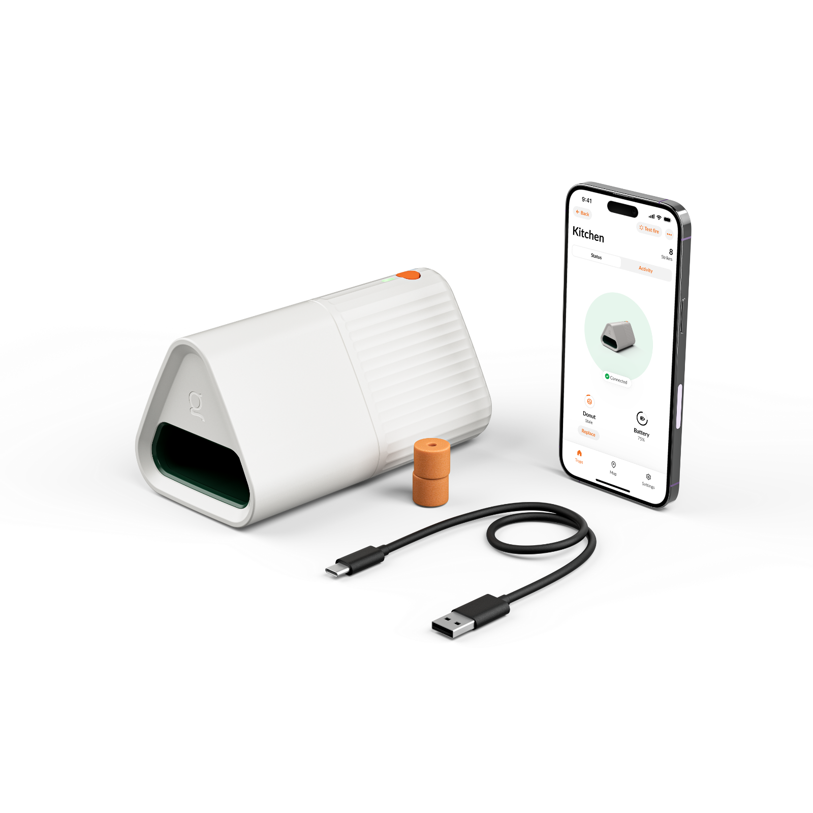 Lieferumfang: Mausefalle, Ladekabel (USB-A auf USB-C), 2 Erdnuss-Lockstoff-Donuts mit Langzeitwirkung, Anleitung