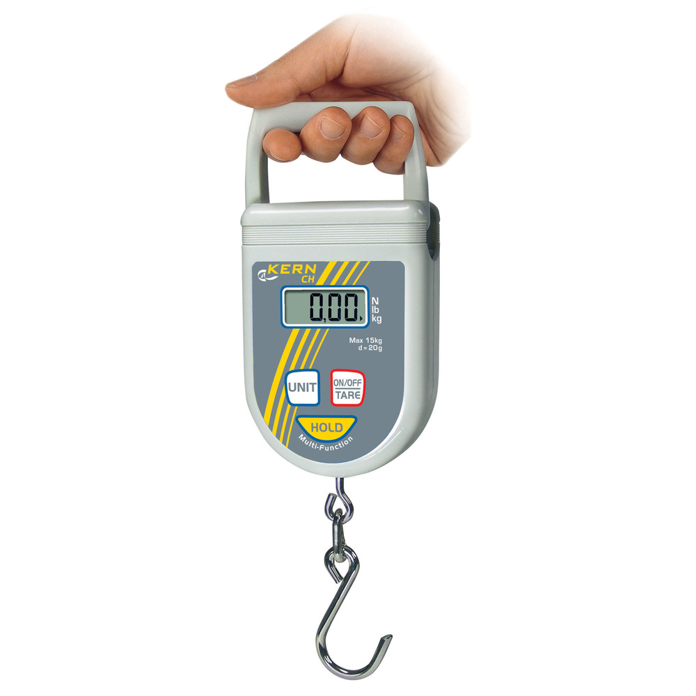 Kompakte Handwaage, LCD-Display-Ziffernhöhe 11 mm, mit Maßband, herausziehbar (Messlänge 100 cm) Edelstahlhaken 270 mm einklappbar, Betriebsbereit mit Block-Batterie (9 V), Wiegebereich bis 50 kg, Teilung 50 g.