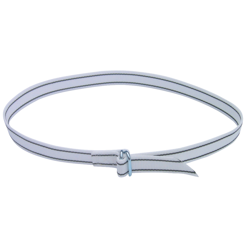 Weiß mit schwarzen Streifen. Gurtbreite 40 mm mit Ringverschluss. Länge 130 cm.