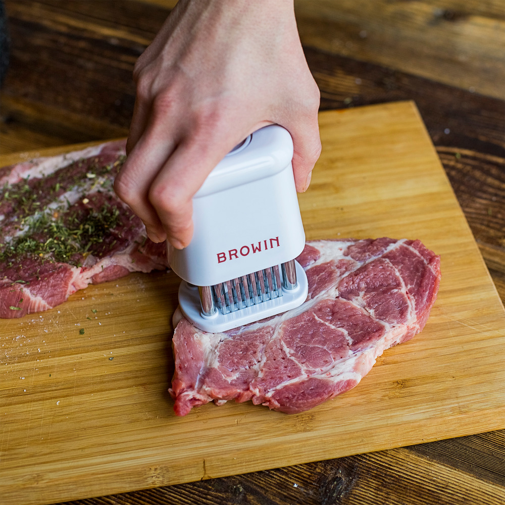 Fleischzartmacher mit 56 Klingen aus Edelstahl.Das Zartmachen des Fleisches mittels Steaker sorgt für eine bessere und gleichmäßigere Aufnahme von Marinaden und Gewürzen und macht das Fleisch zarter und eignet sich ideal zur Zubereitung von z. B. Steaks und Schnitzel.Die Ausfahrsicherung sorgt für eine sichere Handhabung und Aufbewahrung.