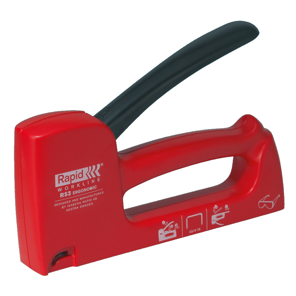 Leicht zu bedienender Handtacker aus schlagfestem Kunststoff. Geeignet für einfachere Arbeiten in Haus und Garten. Verarbeitet mühelos Klammern bis 10 mm.