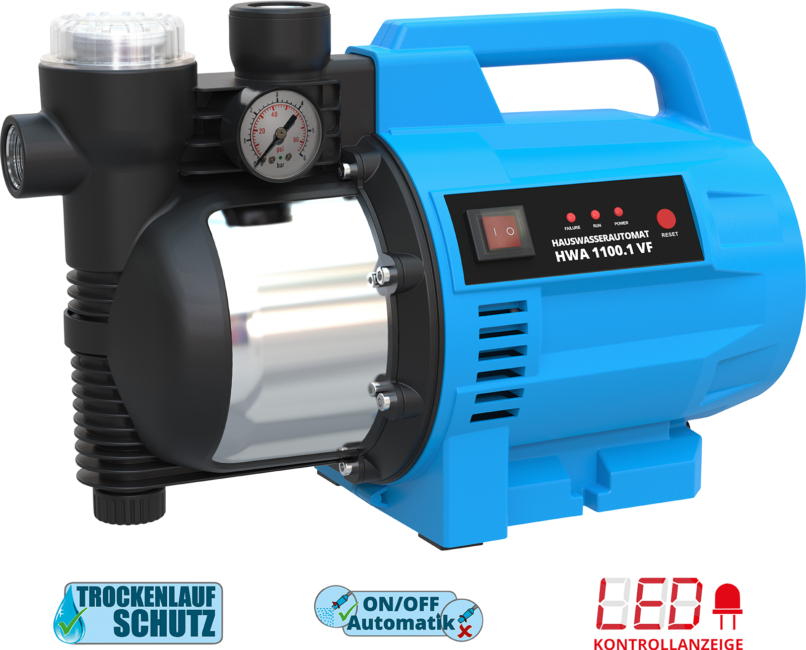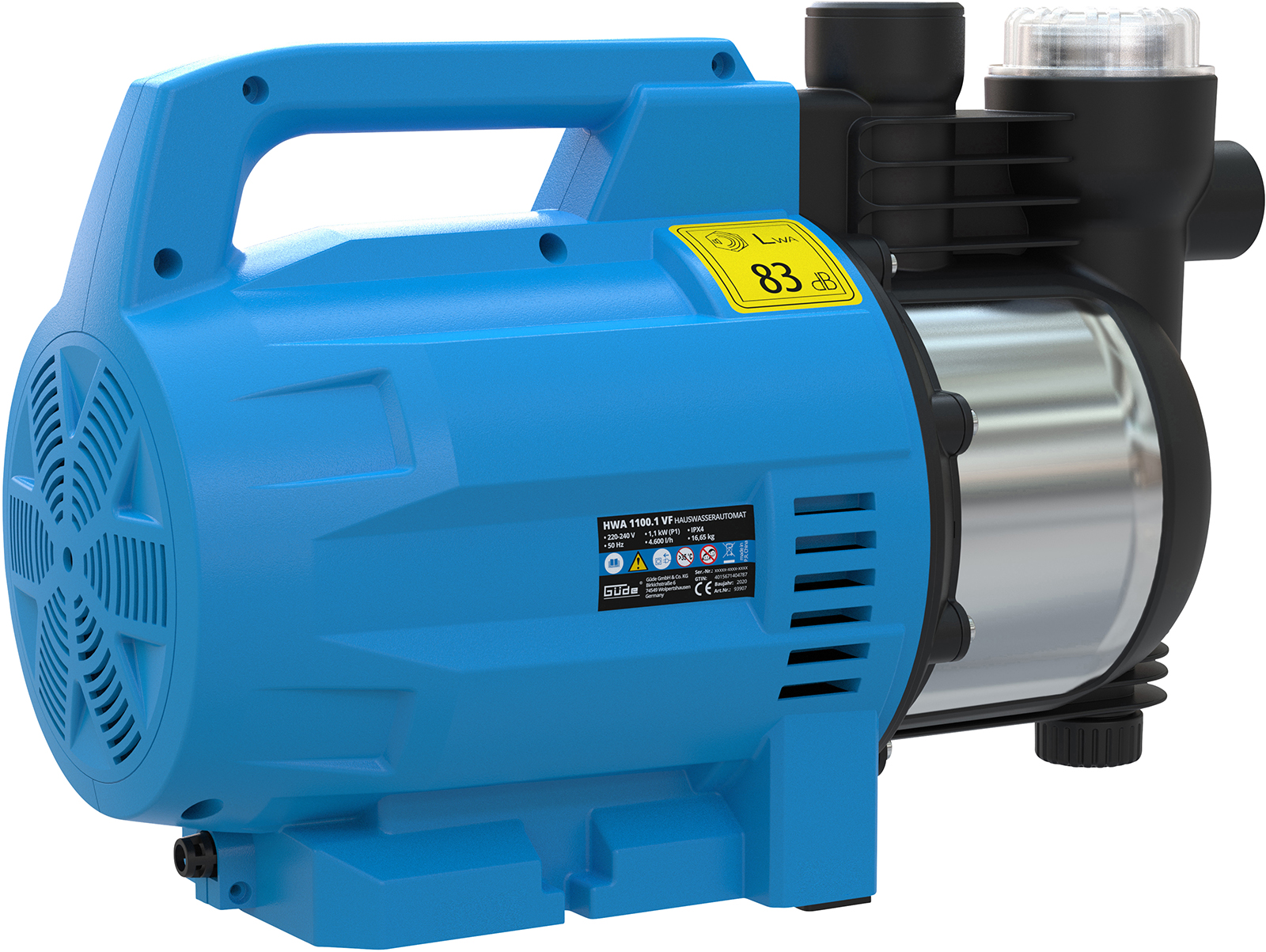Praktische Gartenpumpe mit Gehäuse aus schlagfestem Kunststoff und integriertem Wasserfilter.Leise laufende Pumpe mit max. 4.600 L/h Förderleistung und eine Höchstdruck von 4,6 Bar.Automatische Druckschalter inkl. Thermo-Motor- und Trockenlaufschutz.Anschlussgewinde 1 Zoll IG. Maße: 480 x 220 x 300 mmEigengewicht: ca.11 kg.