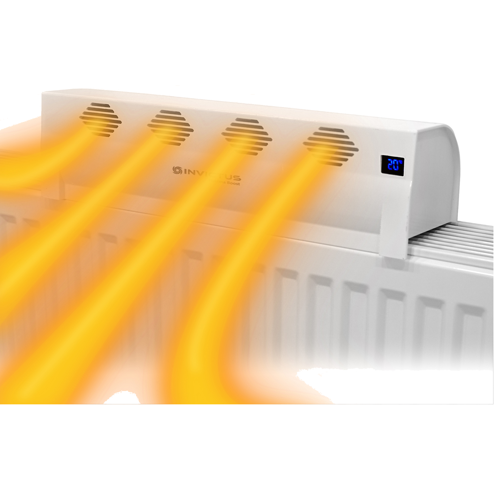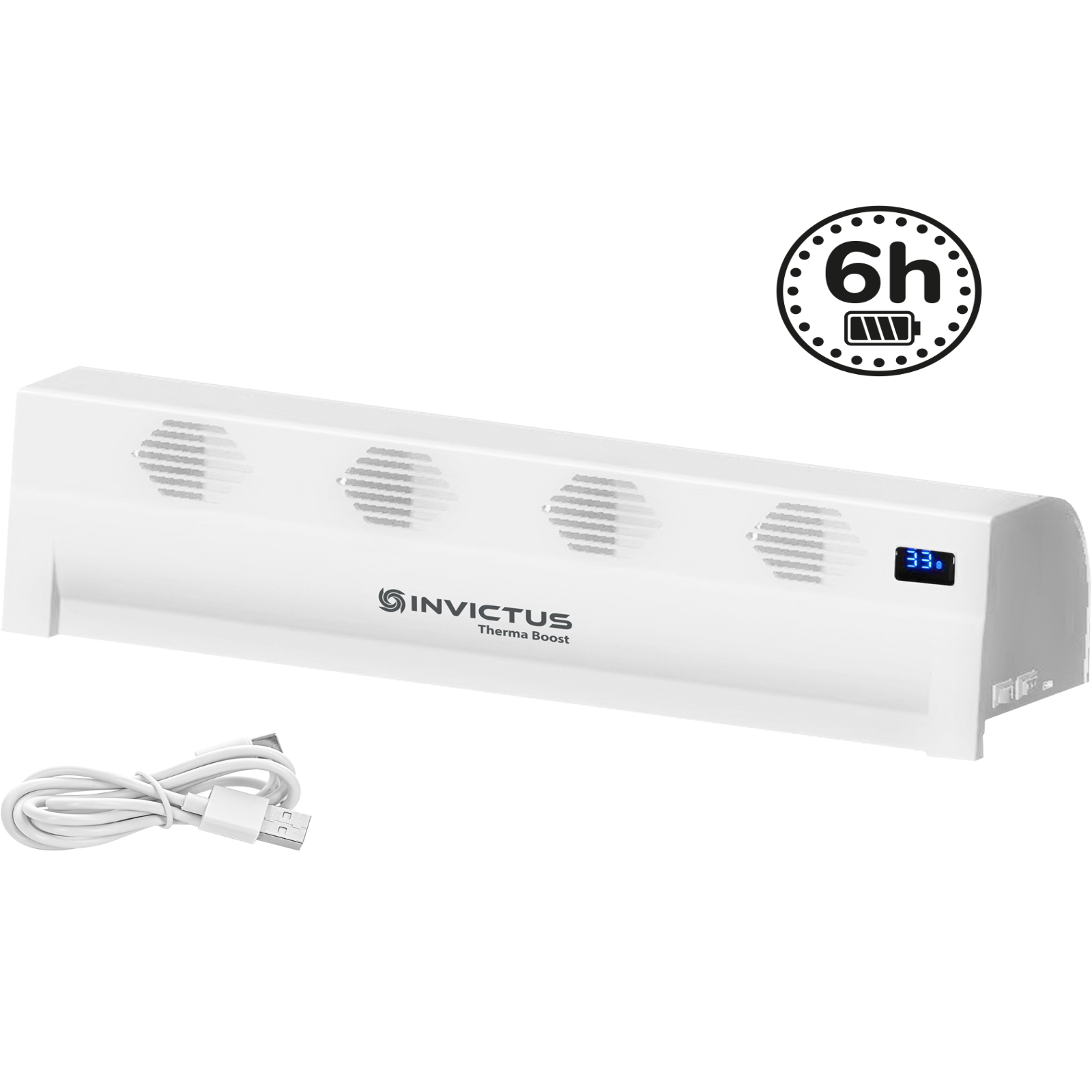 In den kalten Monaten ist es oft nötig, die Heizung anzustellen, um nicht zu frieren und wohlige Wärme in den eigenen vier Wänden zu genießen.Ein übliches Thema ist jedoch, dass die erzeugte Heizungswärme direkt an die Decke steigt und sich nicht im Raum verteilt.Dadurch wird das Zimmer nicht gleichmäßig warm.Damit Sie nicht direkt vor dem Heizkörper sitzen müssen, um die angenehme Temperatur zu spüren, benützen Sie den INVICTUS THERMA BOOST von Genius!Der innovative Heizungsaufsatz verteilt die Wärme besser im Raum und nutzt die Heizenergie effizienter.Die warme Luft strömt in den Raum, kühlt sich nicht an Außenwänden oder Fenstern ab und schafft ein wohltuendes Klima, selbst wenn es draußen bitterkalt ist.Das Beste: Der Wärmezirkulator passt auf alle gängigen Heizungen und sorgt dank seines starken Akkus auch kabellos für eine lange Laufzeit.Stellen Sie den Warmluftventilator einfach auf die Heizung – eine aufwändige Installation ist nicht nötig.Schalten Sie das Gerät ein, und schon kann es losgehen.Maße: 39,3 x 12 x 10 cm.Anwendung:Wenn Sie den Heizungsaufsatz auf den Heizkörper gestellt haben, verteilt dieser mit seinen vier Lüftungskanälen die warme Luft effizient im Raum.Im kabellosen Betrieb verhilft Ihnen der starke Li-Ion Akku ganze sechs Stunden zu einem gleichmäßigeren angenehmen Klima.Durch den separat erhältlichen Netzstecker kann der INVICTUS THERMA BOOST so lange laufen, wie es Ihnen beliebt.Dabei können Sie zwei Stufen einstellen: High und Low.Das integrierte Thermostat sorgt dafür, dass sich der innovative Ventilationsaufsatz von Genius automatisch ein- und ausschaltet, wenn eine gewisse Temperatur erreicht ist.Im Auto-Modus fängt er an zu arbeiten, wenn die Lufttemperatur 33° Celsius beträgt. Unter dieser Grenze schaltet sich der INVICTUS THERMA BOOST von selbst ab.Sie können ihn aber auch im manuellen Modus verwenden. In diesem nutzen Sie das Gerät unabhängig von der Gradzahl.Damit Sie zudem die Temperatur, den eingestellten Modus und den Akkustand immer im Blick haben, bietet Ihnen der Heizungsaufsatz ein praktisches Display.