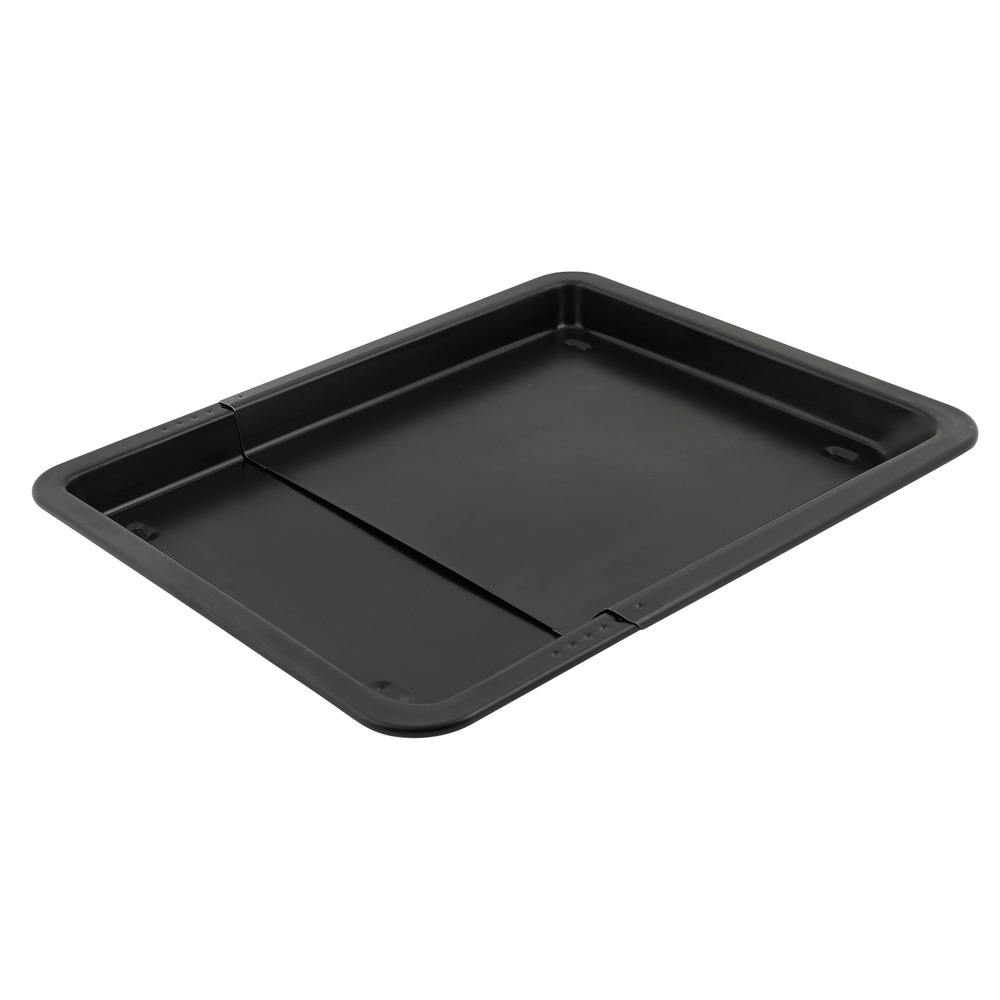 Aus Stahlblech, 2-fach antihaftbeschichtet, hoher Rand, hitzebeständig bis 230°C, stufenlos verstellbar von ca. 33-52 cm. Maße: 33/52x3,5x33 cm.