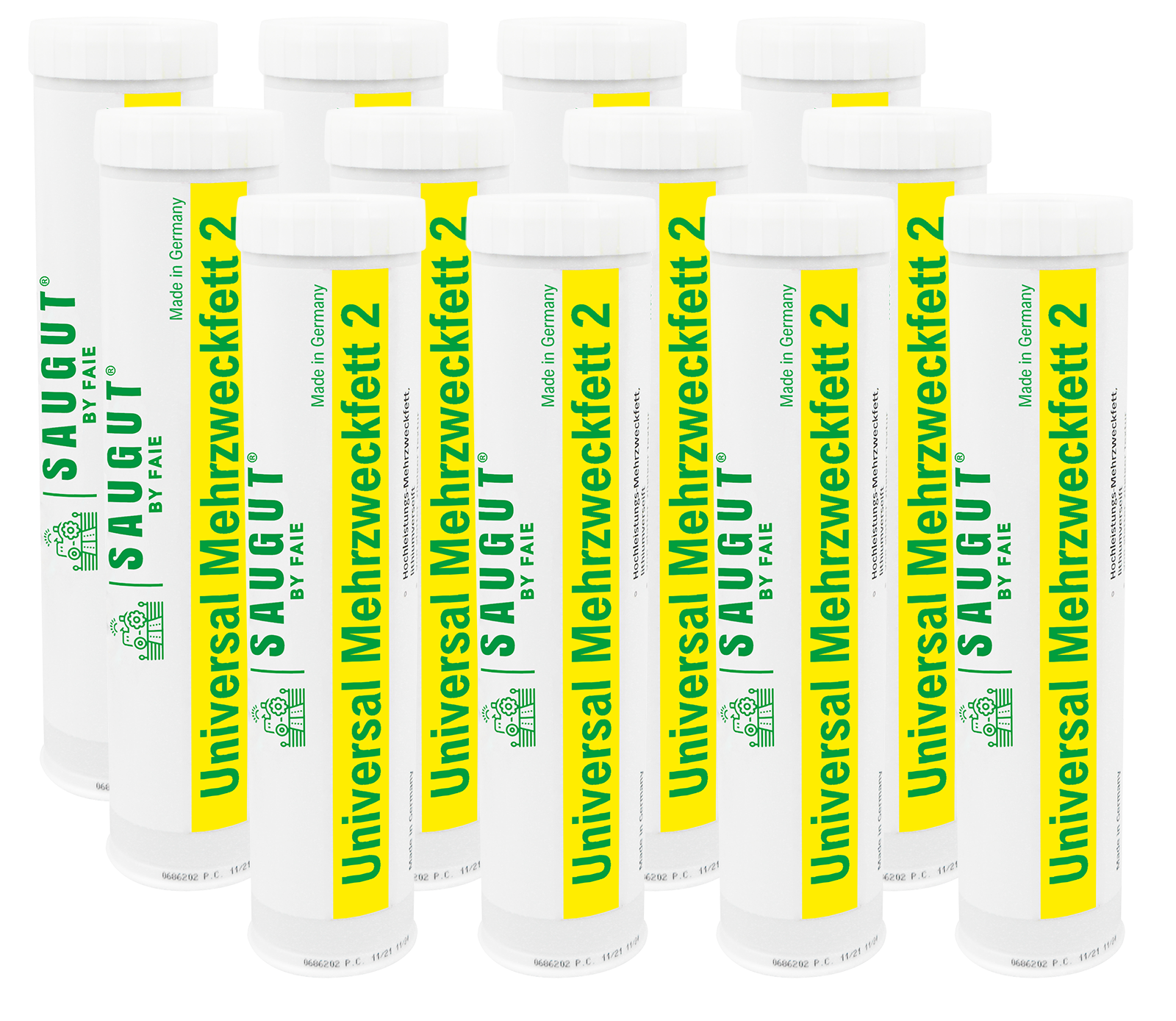 FAIE Sparset mit 12 Stück Kartuschen, gefüllt mit 400 g hochwertigem Universalfett. Hohe Walkstabilität, Wasserbeständigkeit und gutes Korrosionsverhalten. Ideal für die Schmierung von Gleit- und Wälzlagern in Maschinen, Apparaten und Fahrzeugen. Von glatter, zügiger Textur, Temperaturbereich -30°C - +120°C, lithiumverseift, Tropfpunkt 190°C.