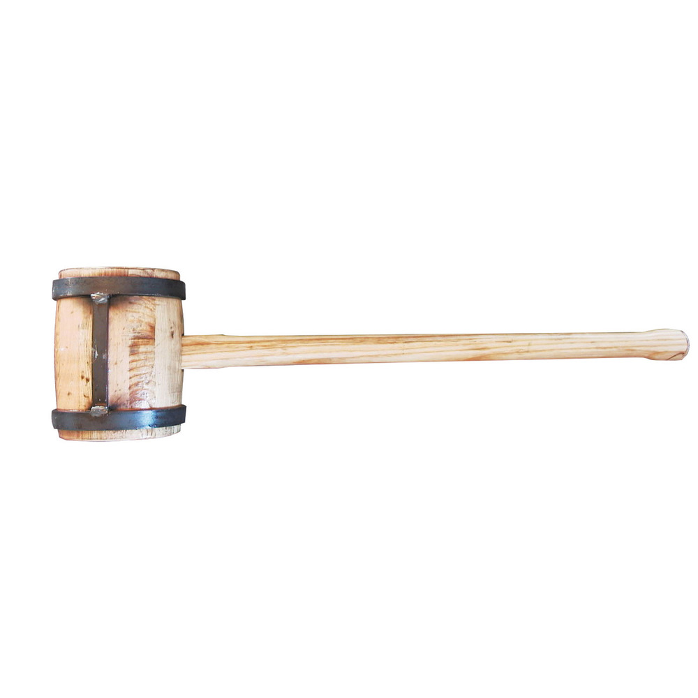 Massiver Holzschlegel mit Stiel und mit angeschweißtem Flacheisen. Schlagfläche Ø 160 mm, Kopflänge ca. 23 cm, Hammerlänge ca. 93 cm, Gewicht 6 kg.