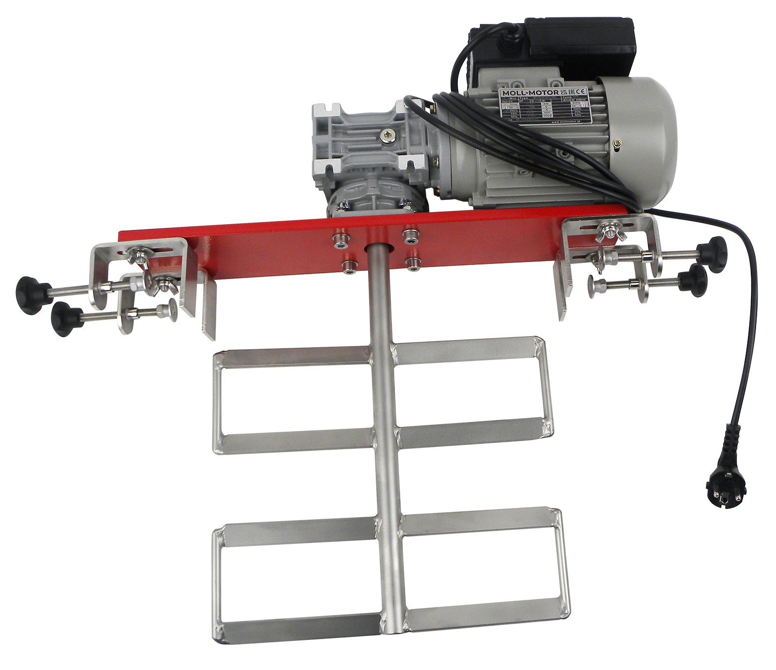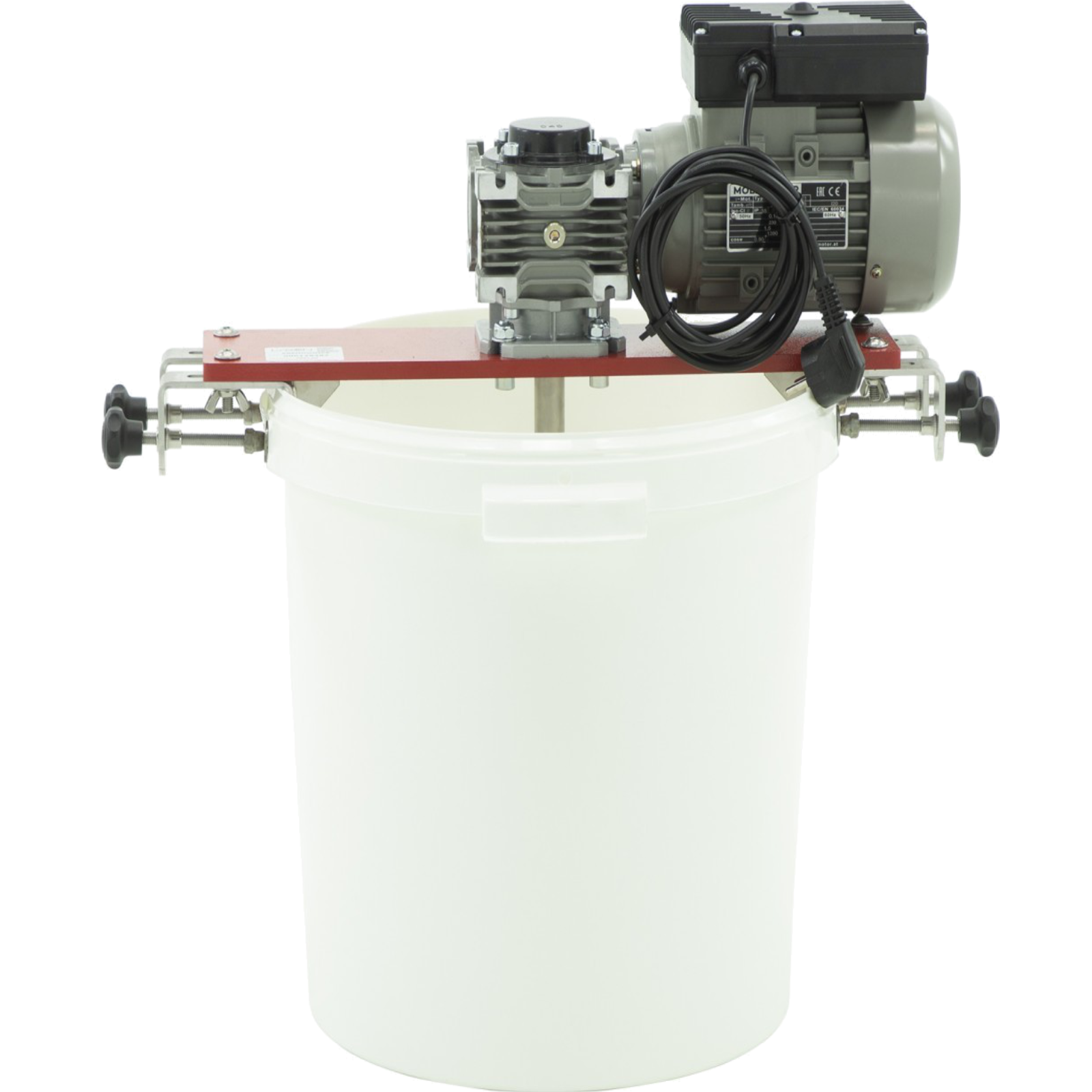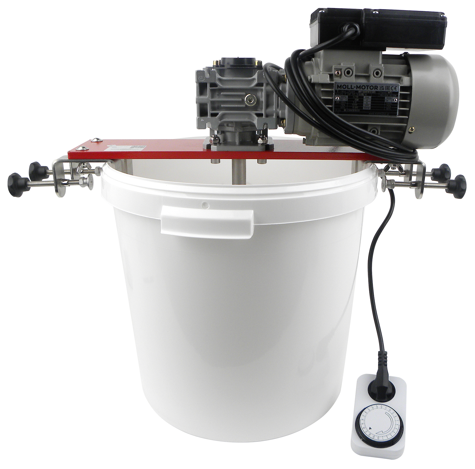 Honigrührgerät zum Aufsetzen auf Kunststoffeimer mit breitem Edelstahlrührwerk zuzüglich Zeitschaltuhr. Der stabile Rundeimer hat eine Höhe von 37cm bei einem Außendurchmesser oben 37,5cm. Aufsatz verstellbar bis zu einem maximalen oberen Eimerdurchmesser von 49cm.