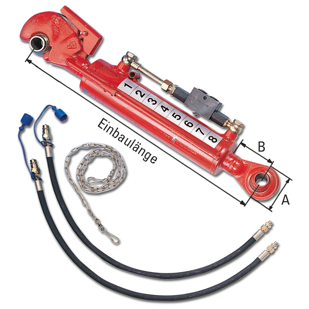 Lieferumfang: komplett mit Anschlussschläuchen inkl. Stecker und Staubschutz, Kette für Fanghaken, Oberlenkerkugel. Inklusive hydraulisch entsperrbarem Rückschlagventil (Sperrblock).