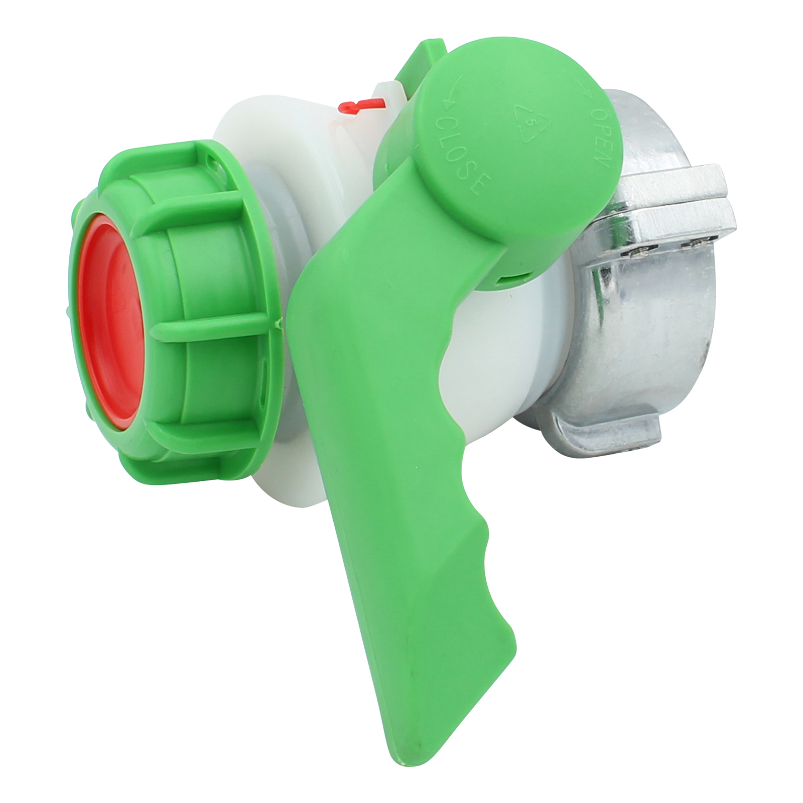Hochwertiger Kugelhahn für IBC System mit einem S75x6 Außengewinde am Innenbehälter. Der Hahn hat einen Arretierungsbügel und eine Absperrschraube, welche vorm erstmaligen Öffnen entfernt werden muss. Eine drehbare Überwurfmutter aus Aluminium dient als Verdrehschutz bei der Montage.