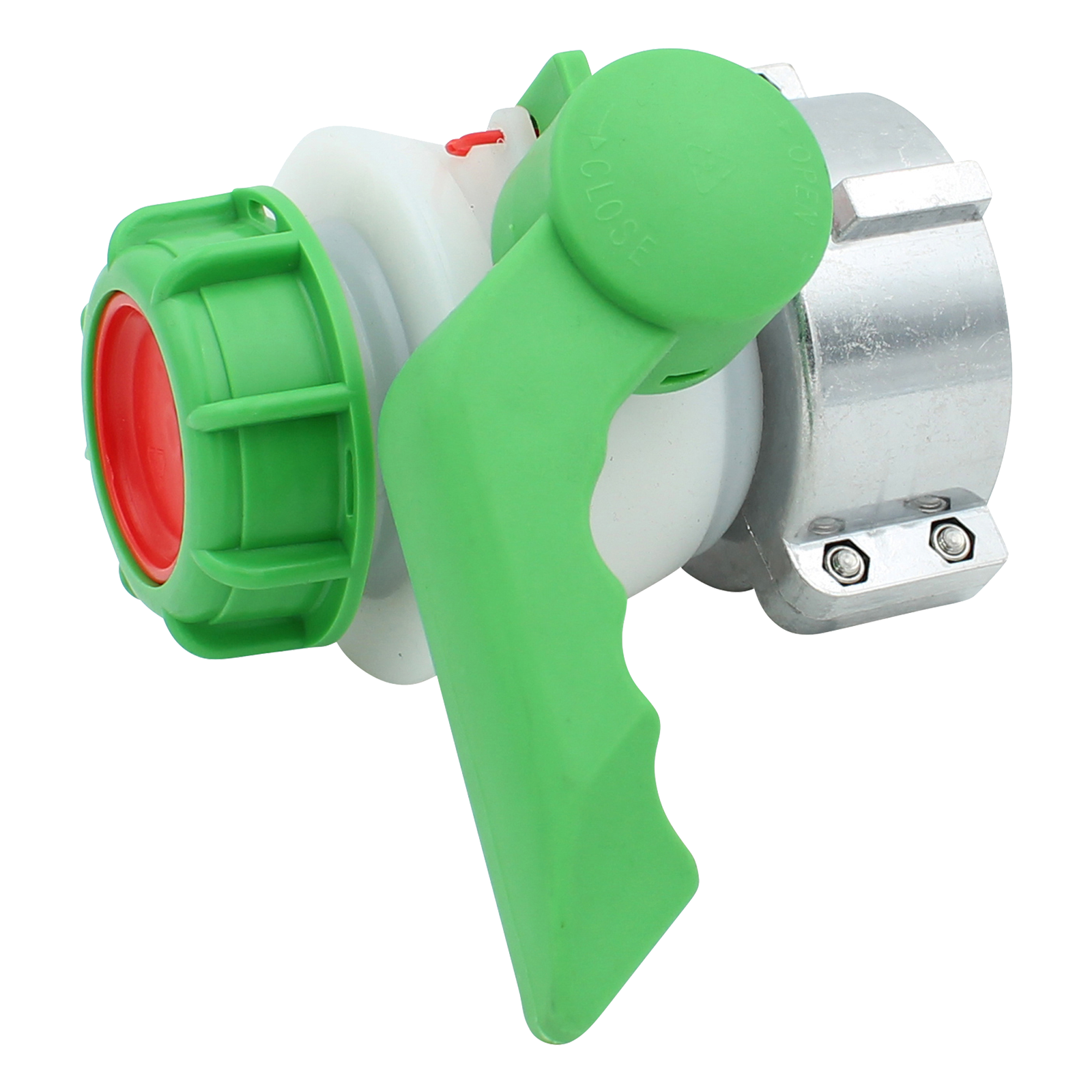 Hochwertiger Kugelhahn für IBC System mit einem S80x6 Außengewinde am Innenbehälter. Der Hahn hat einen Arretierungsbügel und eine Absperrschraube, welche vorm erstmaligen Öffnen entfernt werden muss. Eine drehbare Überwurfmutter aus Aluminium dient als Verdrehschutz bei der Montage.