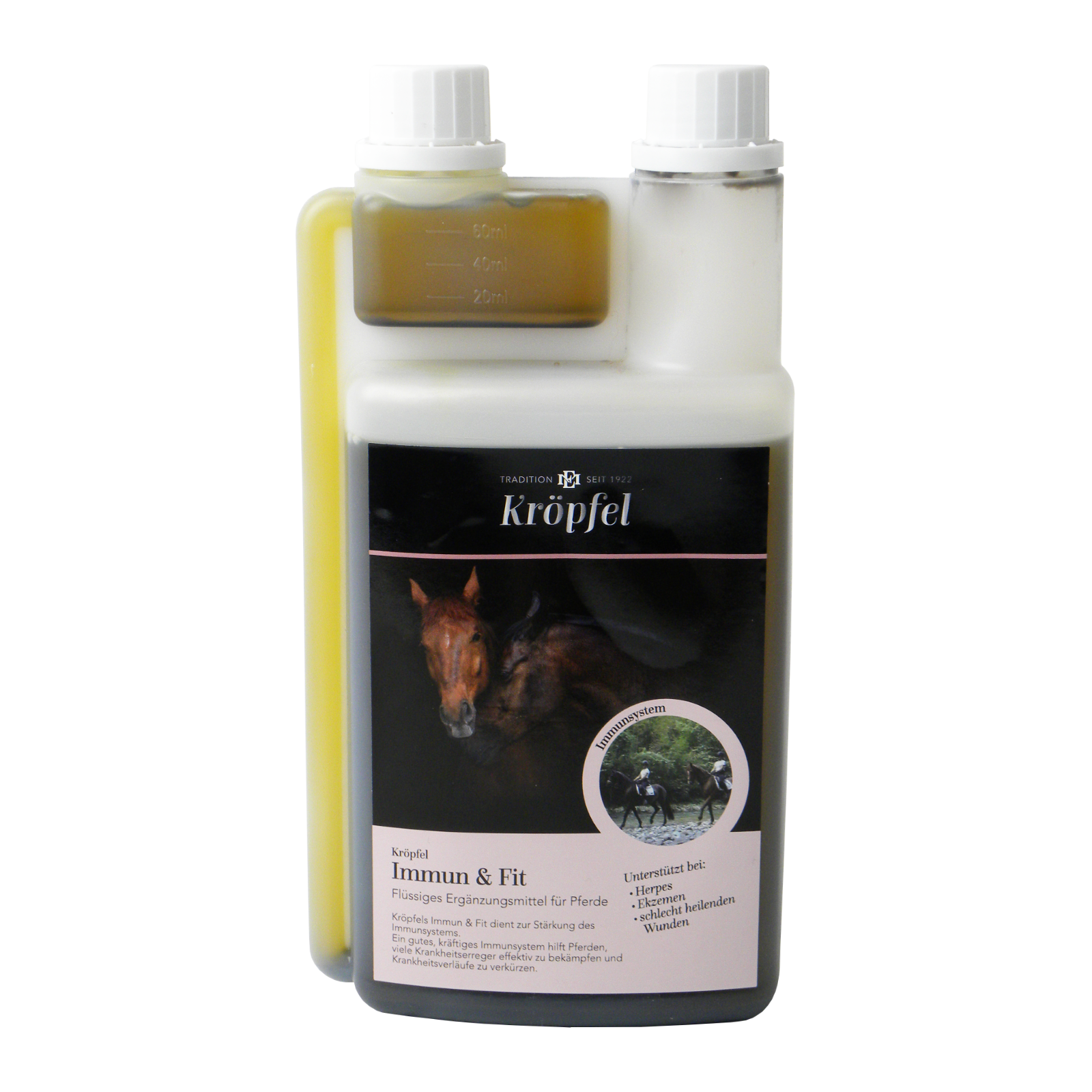 Stabilisiert das Immunsystem. Wirkt bei Herpes-Erkrankungen, Allergien, Ekzemen und Bronchitis. Hilft gegen schlecht heilende Wunden und unterstützt in Stresssituationen. Dosierflasche 1.000 mlAnwendung: Pferde und HundeHinweis für die ordnungsgemäße Verwendung:Wir empfehlen eine Fütterungsdauer von mindestens drei Wochen.Fütterungsempfehlung:Die empfohlene Menge zum täglichen Futter zugeben:Kleine Hunde: 5-10 Tropfen (0,5-1 ml)Mittlere Hunde: ½ Teelöffel (1,5 ml)Große Hunde: 1 Teelöffel (3 ml)Großpferde (600kg LG)Normalbedarf: 2x täglich 20 mlMehrbedarf: 2-3 mal die oben angegebene Menge für mindestens 10 TageNicht an trächtige Tiere verfüttern. Bei der Einnahme von Medikamenten oder bei einer Beeinträchtigung der Leber sollte Kröpfel Immun & Fit nur nach Rücksprache mit dem Tierarzt gefüttert werden.