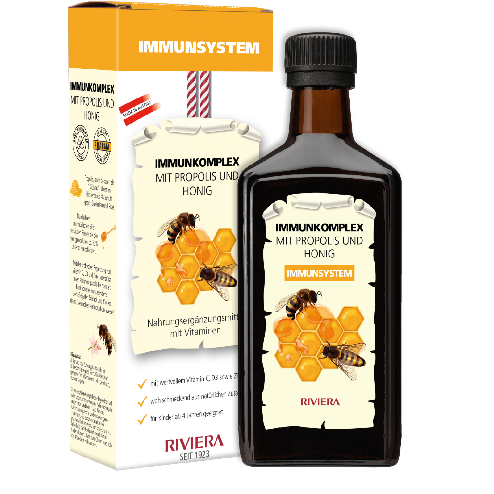 Der RIVIERA Immunkomplex kombiniert Propolis und Honig mit den wichtigen Vitaminen C, D3 sowie Zink, um das Immunsystem gezielt zu unterstützen. Dank Propolis und Honig wird die schützende Wirkung optimal ergänzt. Propolis, auch „Kittharz“ genannt, dient den Bienen im Stock als natürlicher Schutz gegen Bakterien und Pilze.