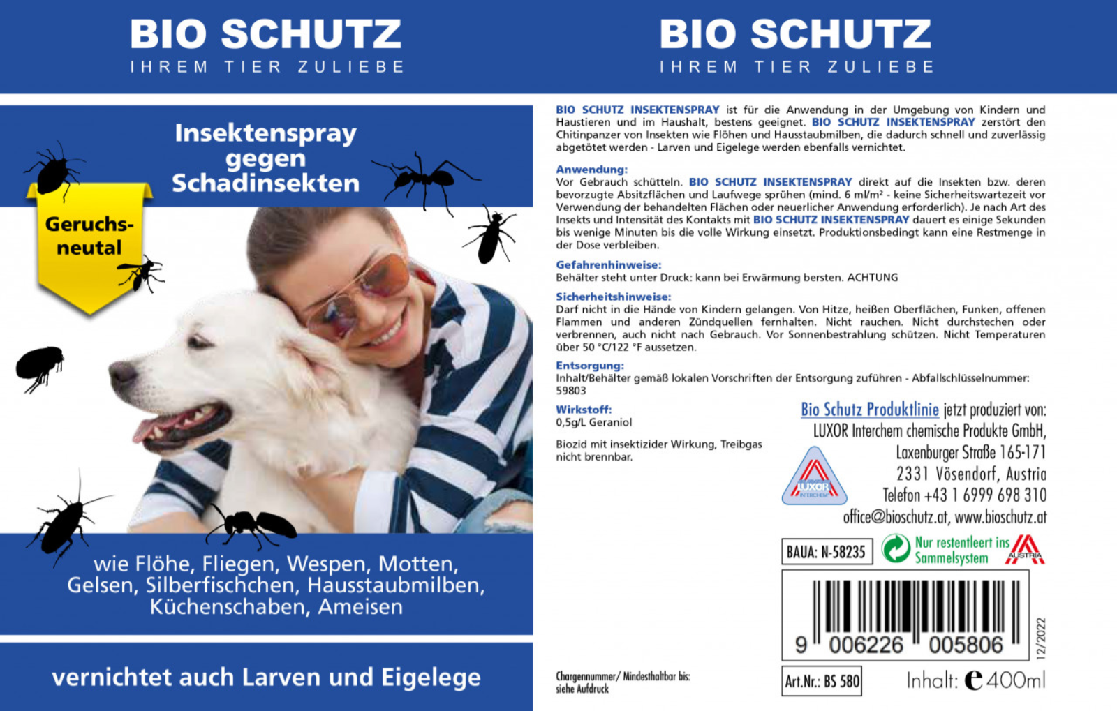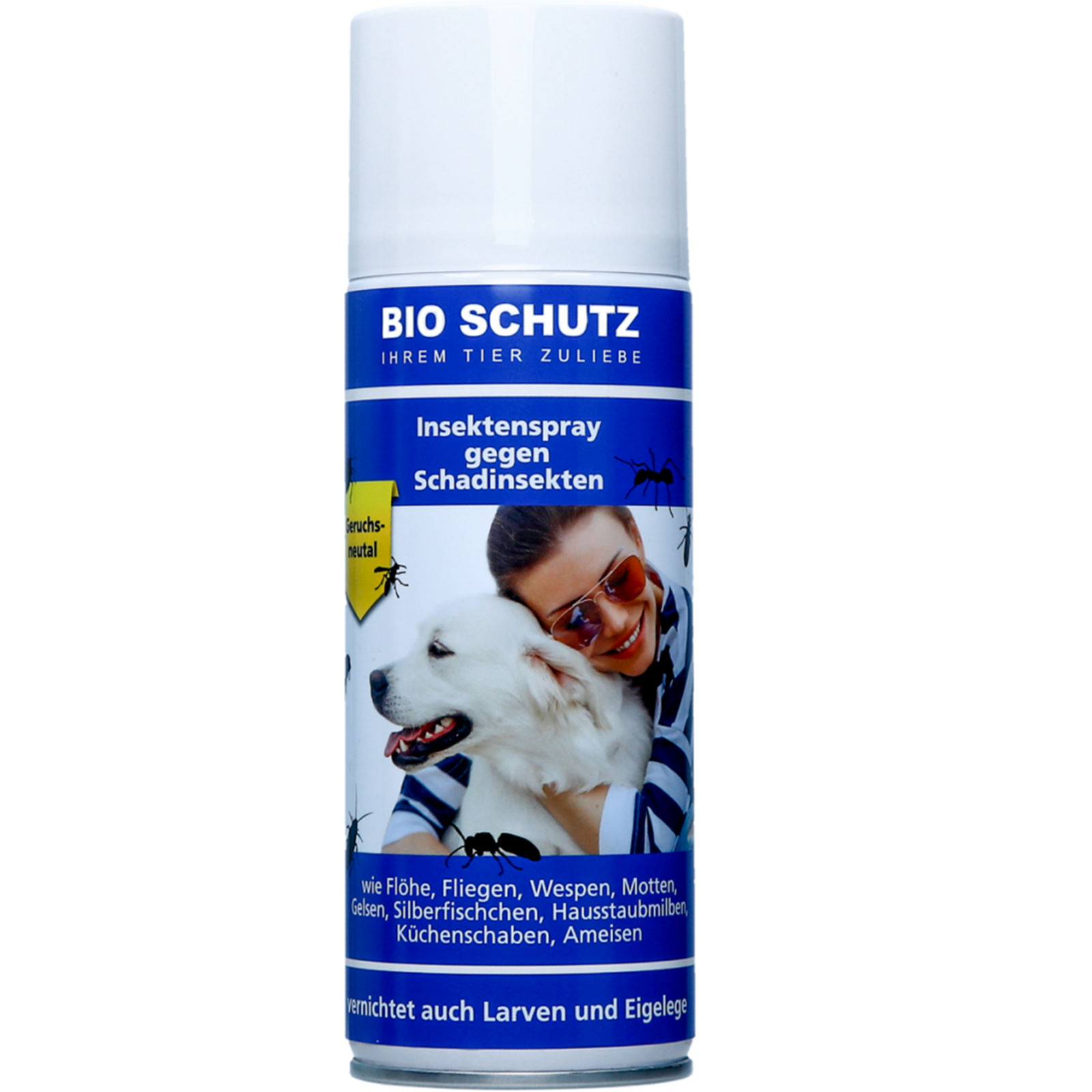 BioSchutz Insektenspray ist die effektive Waffe gegen alle Insekten und derenBrut. Es eignet sich sowohl hervorragend zur großflächigen Bekämpfung vonFlöhen als auch zum Einsatz gegen Schädlinge wie Motten, Fliegen, Gelsen,Küchenschaben, Wespen, Ameisen, Silberfischchen, Hausstaubmilben, usw. DasProdukt wirkt bis zu 8 Wochen und ist geruchsneutral.Spraydose 400 ml.BAUA-Registrierungsnr. N-58235Natürlicher Wirkstoff GerianolGeraniolist ein naturbasierender Stoff, der Bestandteil zahlreicher Pflanzen und Kräuter ist. Er findet sich u.a. in Geranien, Rosen, im Koriander, im Lorbeer,im Thymian sowie im Currykraut. Eingesetzt wird Geraniol auch in der Parfümindustrie, für aromatherapeutische Anwendungen und in Lebensmitteln. AlsWirkstoff zur Insektenbekämpfung hat Geraniol vor allem den Vorteil, dass es sowohl hervorragend als Repellent (wehrt ab, vertreibt) wie auch effektiv alsabtötendes Insektizid wirken kann. Damit ergibt sich eine breite Palette an Produkten, die je nach Ausbringung und Dosierung zur Prophylaxe oder akutenAnwendung, vor allem gegen Flöhe und Zecken, ideal sind. Der größte Vorteil ist allerdings, dass Geraniol sich vor allem von üblichen toxischen Insektizidenunterscheidet. Seit Jahrzehnten wurden hauptsächlich Gifte gegen Insekten eingesetzt. Vor allem Nervengifte belasten das Immunsystem von Menschund Tier, sowie die Umwelt. Geraniol ist kein Nervengift. Stattdessen wird lediglich das Chitin der Insekten angegriffen, was zu ihrem Absterben führt.Mensch und Haustier haben kein Chitin, bleiben von diesem Effekt unberührt. Die gewünschte Wirkungwird bereits bei geringer Dosierung erreicht, so dassin Bio Schutz Produkten selbst der typische Geruch von Geraniol kaum wahrnehmbar ist.BIO SCHUTZ Insektenspray vorsichtig verwenden. Vor Gebrauch stets Kennzeichnung und Produktinformation lesen.
