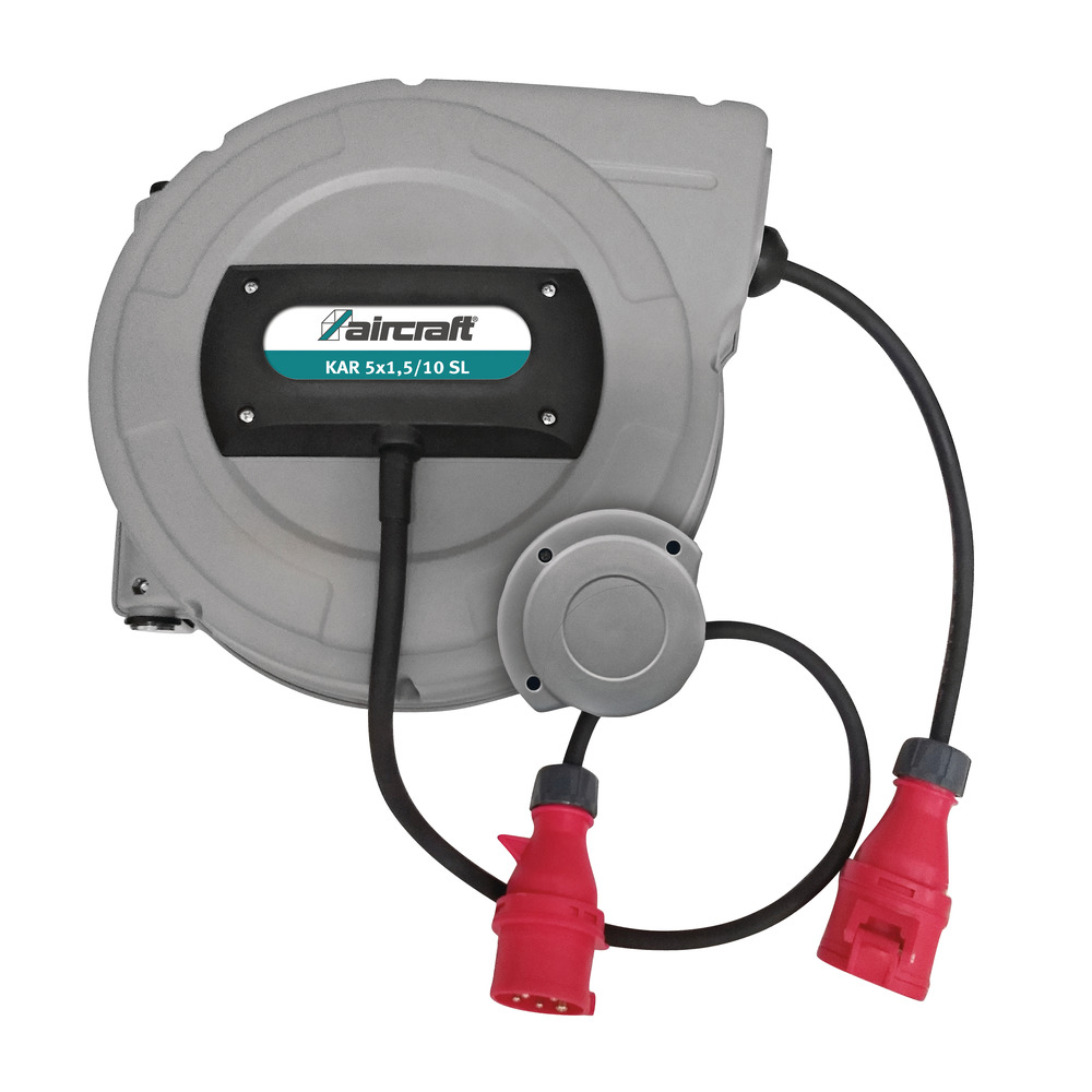 Kabelaufroller mit automatischer Rücklaufbremse - sie verlangsamt den Kabeleinzug und erhöht so die Arbeitssicherheit - keine Verletzungsgefahr durch zurückschnellendes Kabel. Arretierung und automatisches Aufrollen des Schlauches durch einfaches Ziehen. Gehäuse aus schlagfestem Kunststoff, schwenkbarer Stahlbügel zur Wand- oder Deckenaufhängung.Technische Daten:Anschlussspannung: 400 VAnzahl der Adern: 3Anschlusskabellänge: 1 mKabellänge: 10 mLeistung Kabel ausgerollt: 2300 WLeistung Kabel aufgerollt: 1000 WStecker: 5x16 A EuronormMaße: 38,4x32,2x19,9 cmGewicht: 10 kg