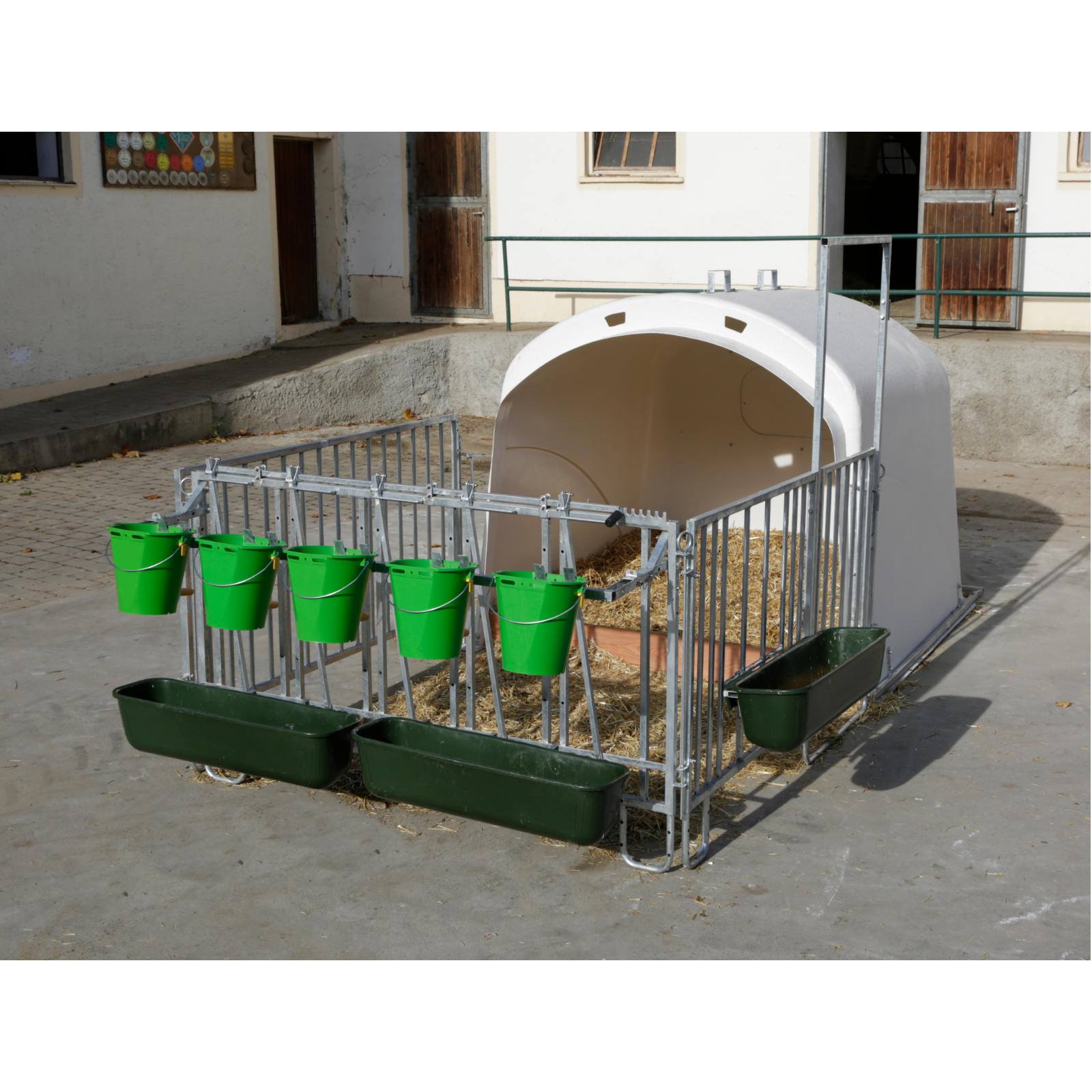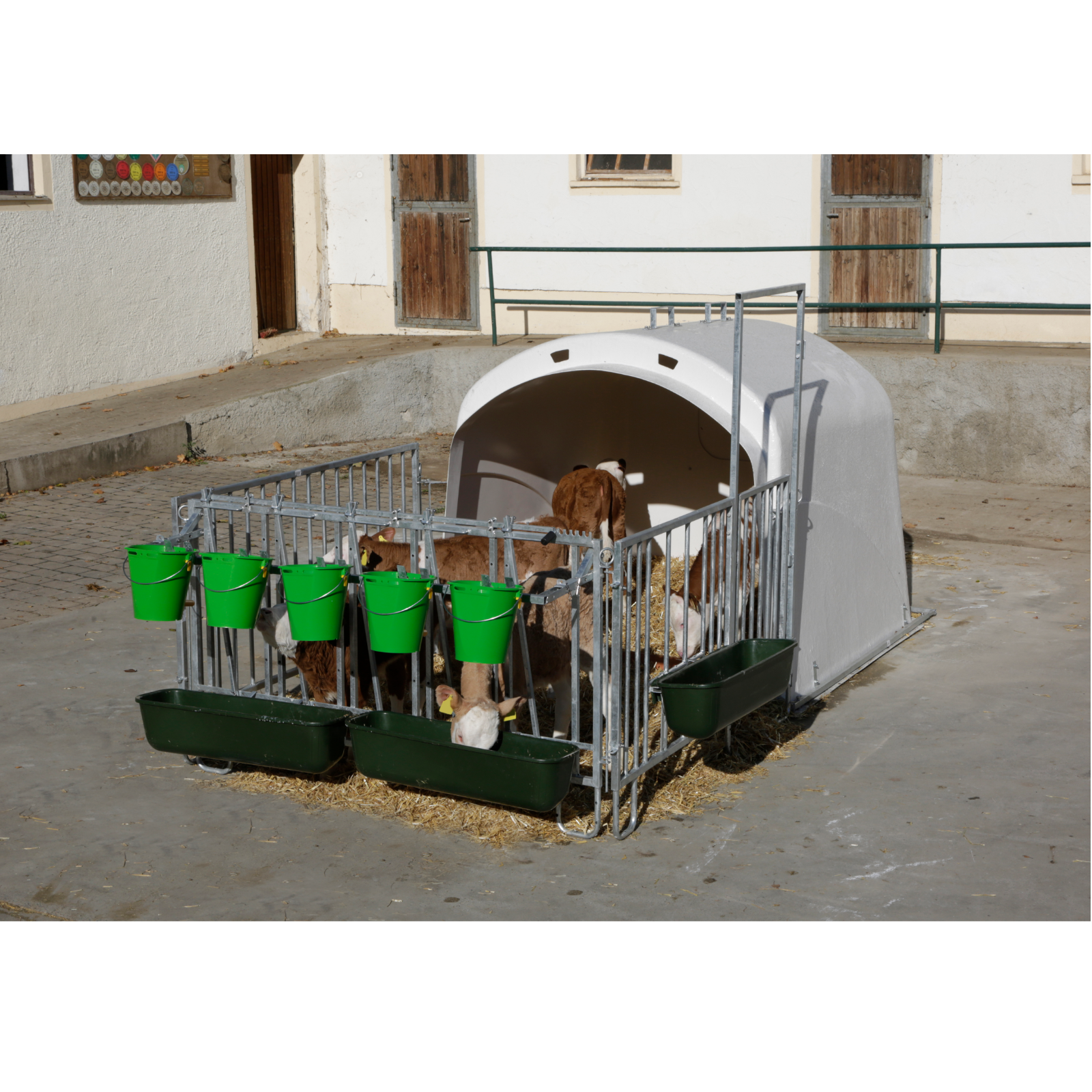 Gruppen-Kälberiglu aus GFK für bis zu 5 Kälber. Inklusive Verstärkungsrahmen und Umzäunung mit einzeln versperrbaren Fressplätzen. Seitengitter schwenkbar, große Eingangstür (Kälberwagen-tauglich).