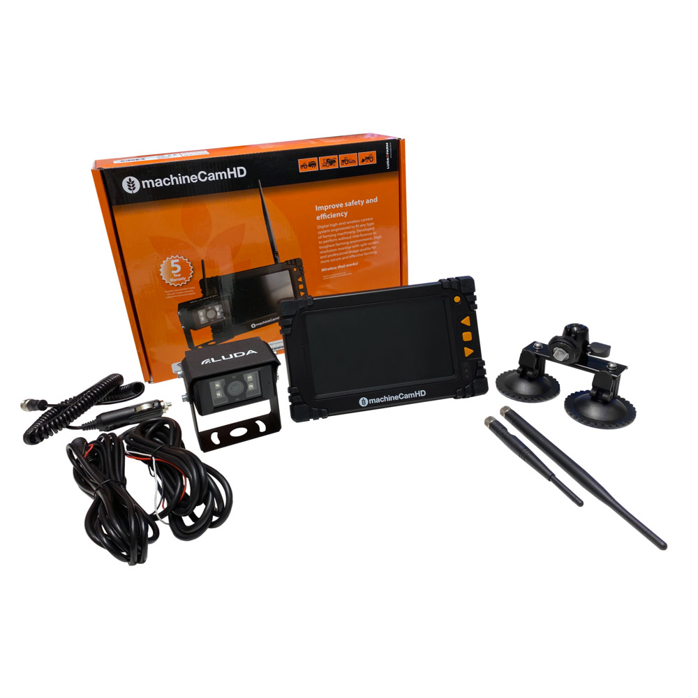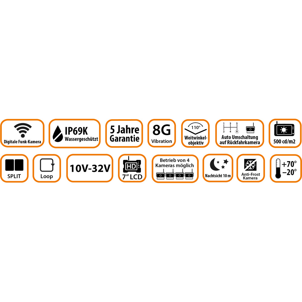 Die MachineCam HD ist ein robustes, digitales Funk-Kamerasystem. Dieses hochwertige Komplett-Set ist einfach zu installieren und zu bedienen. Die Kamera überträgt drahtlos auf eine Entfernung von bis zu 300 Metern scharfe, hochauflösende und störungsfreie HD Videobilder an den mitgelieferten großen 7“ Monitor. Die HD Kamera hat eine Nachtsichtfunktion (ca. 10 Meter), eine Frostschutz-/Antibeschlagfunktion und ist vibrationsfest bis 8G. Die Kamera hat ein Normalbild/Spiegelbildfunktion und Sie können Rangierlinien in den Monitor einblenden. Außerdem hat der Monitor eine Videoaufnahmefunktion auf Micro SD Karte. Multibildschirmansicht (Split Screen) bei 2 Kameras, Videoschleifenansicht für bis zu 4 Kameras. Auto-Erkennung einer bestimmten Kamera bei Rückwärtsgang möglich. Die Stromversorgung der Kamera erfolgt über die Fahrzeugelektrik oder über einen als Zubehör erhältlichen aufladbaren PowerBank Akku mit Magnethalterung. 5 Jahre Garantie bei online-Registrierung.Technische Spezifikationen:Sendertyp