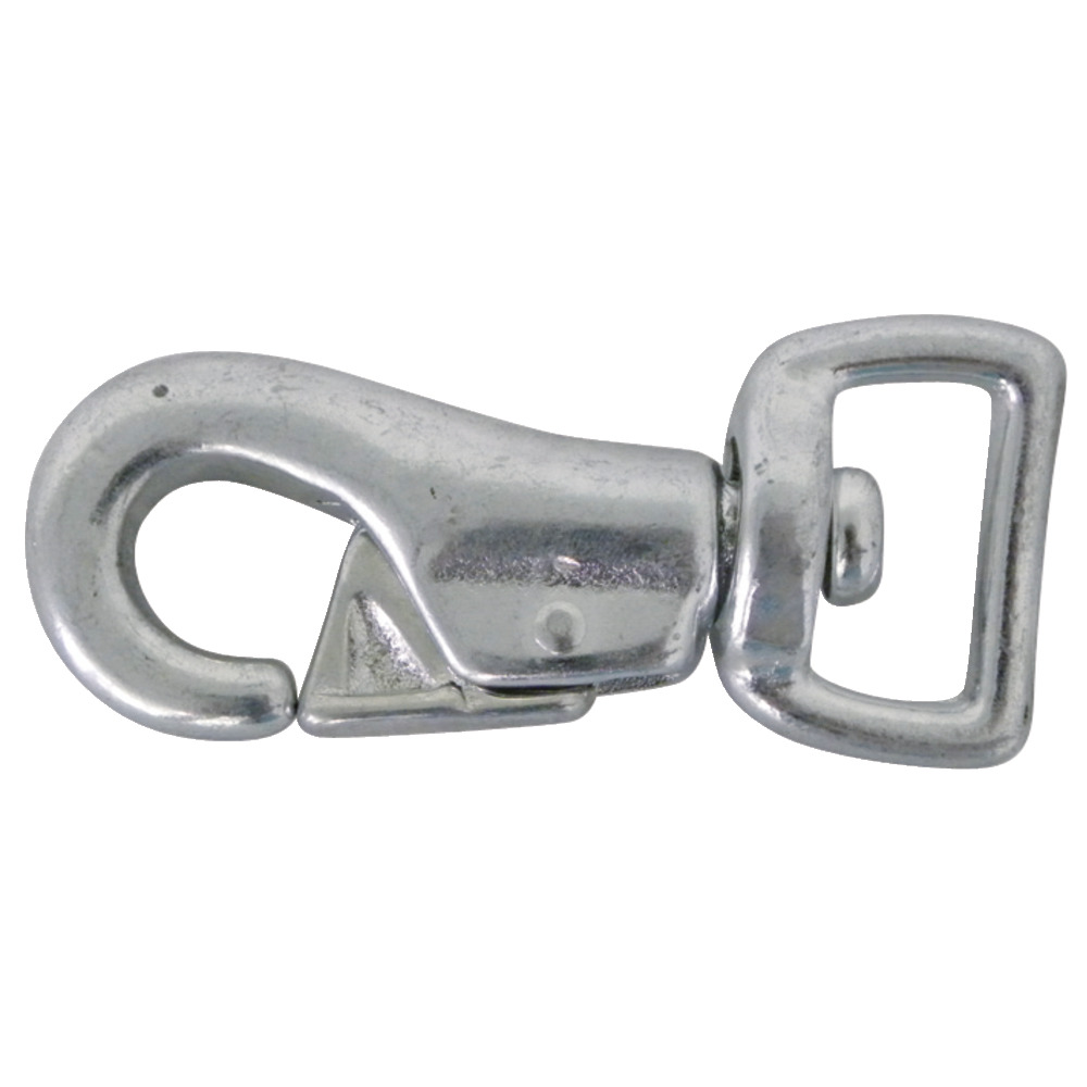 Mit eckigem Wirbel für Band. Der Karabiner besteht aus verzinktem Metall was ihn langlebig und robust macht.