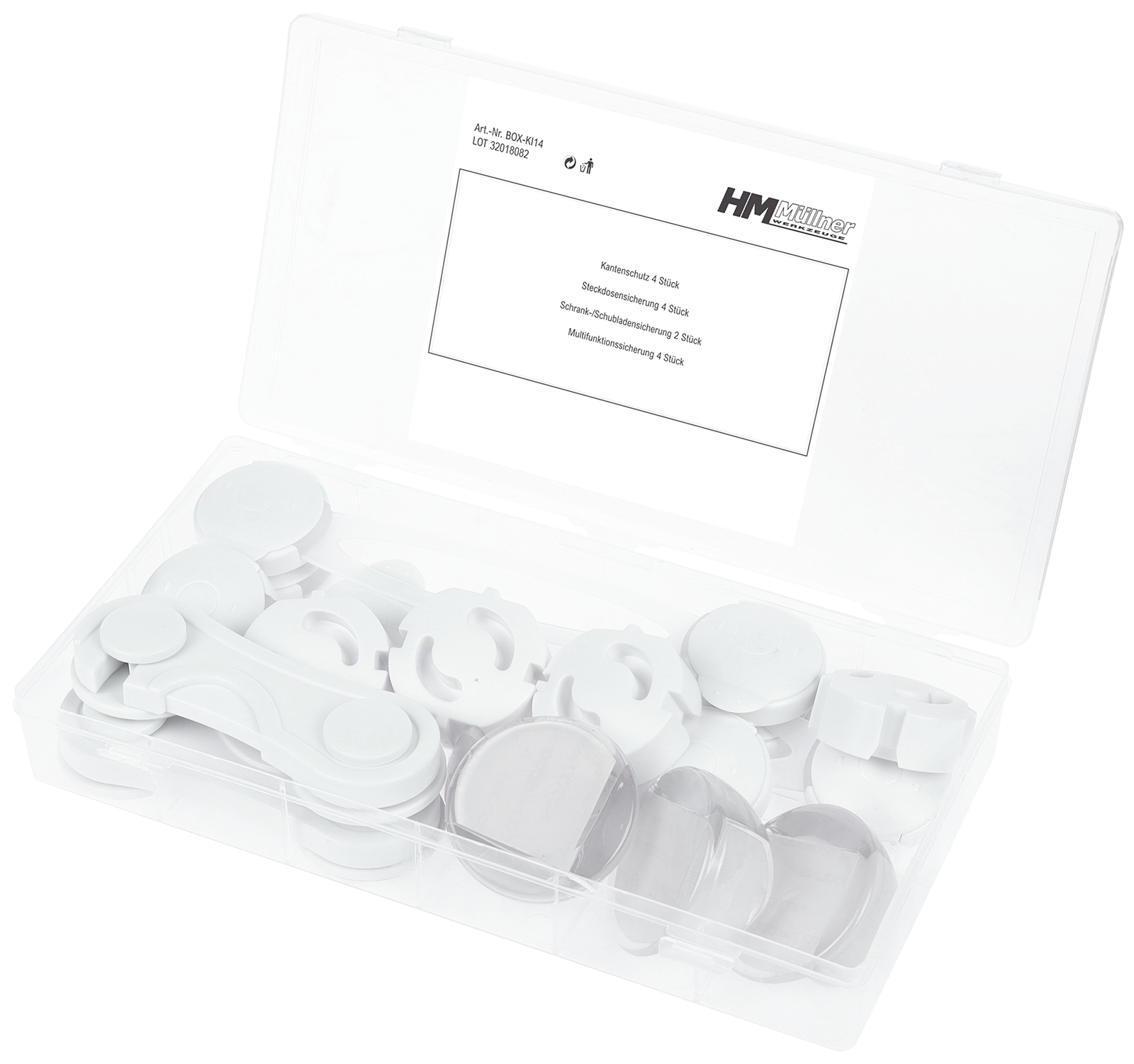 Kindersicherung-Sortiment, 14-tlg. aus hochwertigem Kunststoffeinfache Handhabung und Montage, kindersicheres Verschließen von Schubladen und Schränken,Schutz bei Kantenvier Ausführungen:Multi-/Schubladen-/Steckdosensicherung, KantschutzInhaltje 4 Stück Kantenschutz, Steckdosenschutz, Multisicherung2 Stück Schubladensicherung