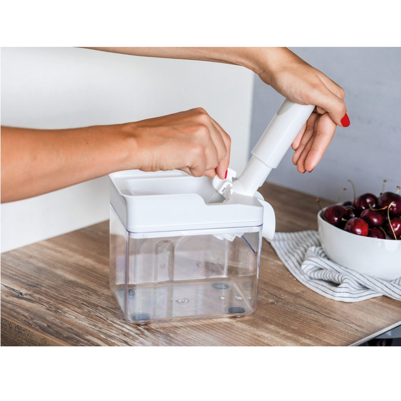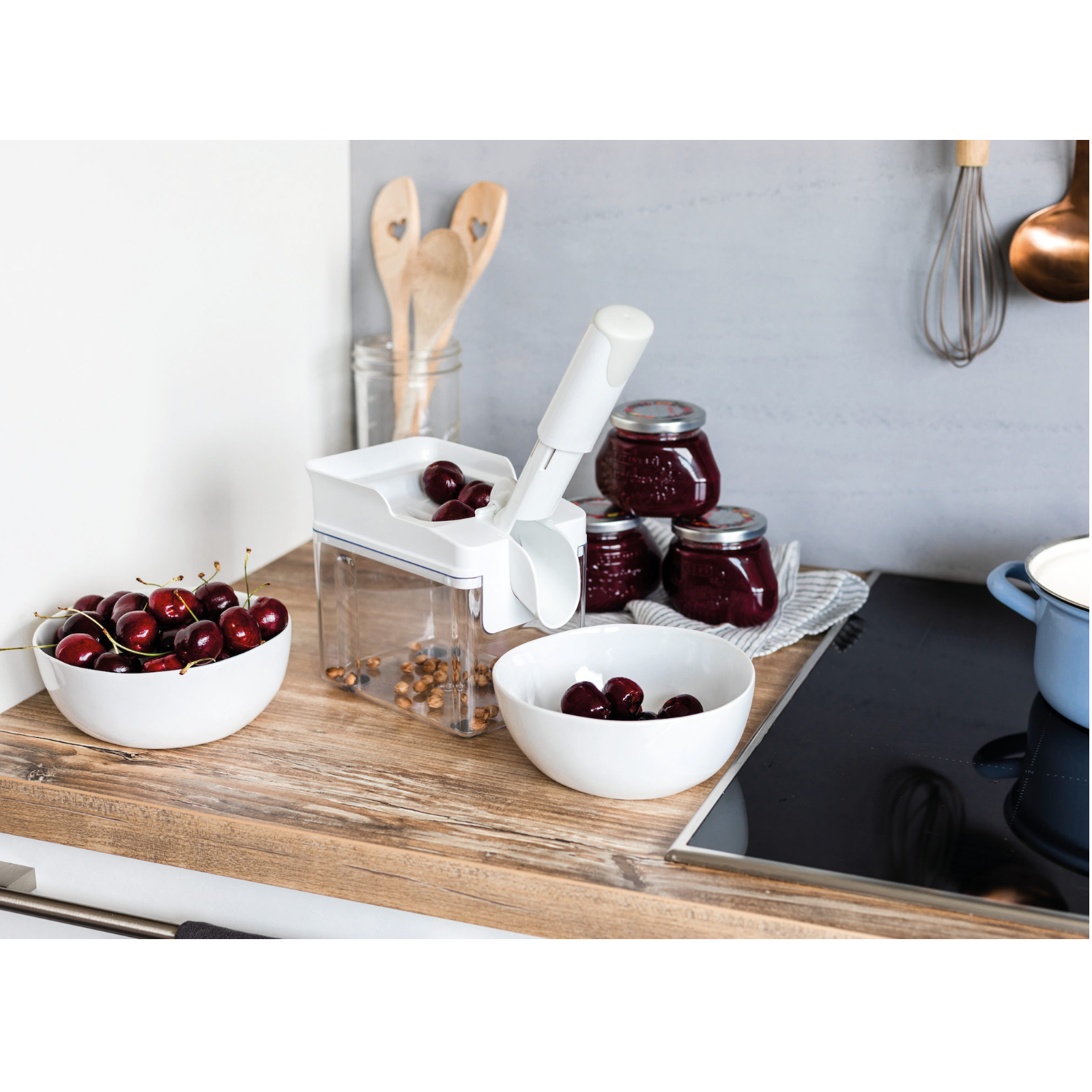 Was gibt es Leckeres als eine frisch gebackene Kirsch-Tarte oder selbstgekochte Kirschmarmelade?Mit dem Kirschentkerner sparen Sie sich die mühsame Handarbeit des Entkernens.Das clevere Gerät entkernt bis zu 15 kg frische oder konservierte Kirschen pro Stunde – schnell und sauber.Nach der Nutzung kann der Kirschentkerner platzsparend verstaut werden, ähnlich wie eine einfache Schüssel.Der Handgriff des Stößels lässt sich demontieren und in die Auffangschale legen.In der Anwendung überzeugt der Kirschentkerner durch perfekt entkernte Kirschen, die sich auch hervorragend als Dekoration eignen.Die große, schräg gestellte Schütte sorgt für eine einfache Handhabung: Die Kirschen rutschen Stück für Stück unter den Stößel und werden mit nur einem Handgriff entkernt.Die Kerne sammeln sich in der großen Auffangschale, die nicht zwischendurch geleert werden muss.Gummierte Füße bieten einen rutschsicheren Stand, und die Softtouch-Zone macht den Griff angenehm und sicher.Auch die Reinigung ist einfach und schnell gemacht:Den Stößel unter fließendem Wasser abspülen, den Rest in die Spülmaschine geben.So bleibt mehr Zeit für das Genießen Ihrer köstlichen Kirschkreationen!Maße: ca. 16,5 x 11,5 x 16 cm.