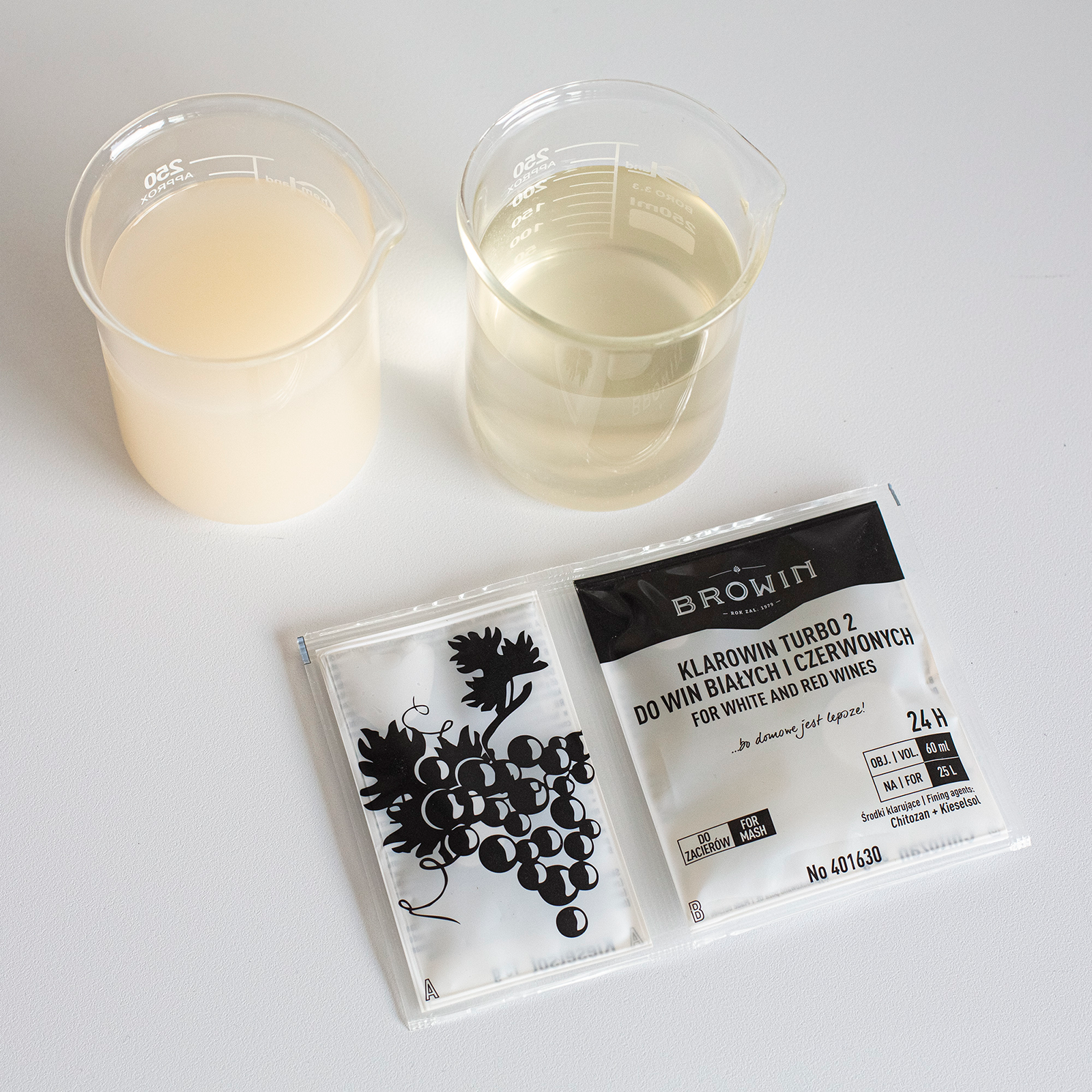Achtung: Beim Durchführen des Klärens muss darauf geachtet werden, die Mittel gemäß Anleitung zu dosieren, da die Verwendung einer zu großen Dosis sekundäre Trübungen oder die Änderung der Weinfarbe verursachen kann.