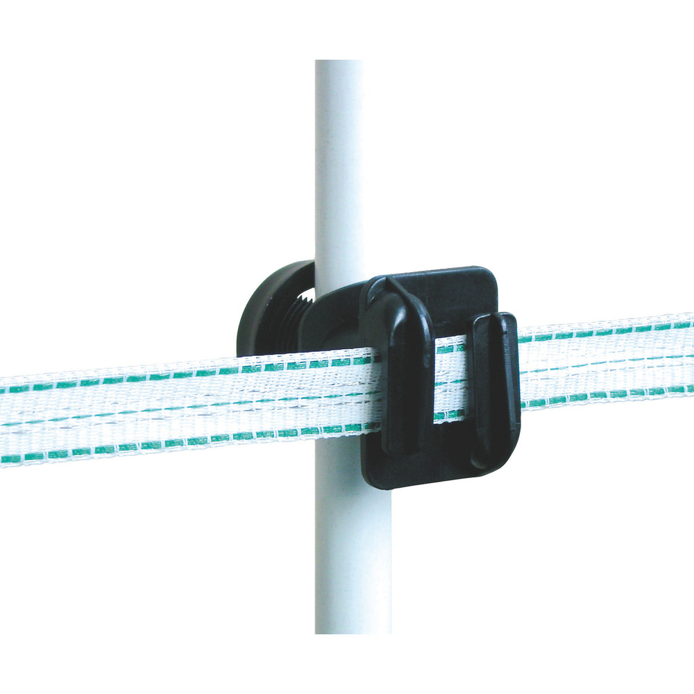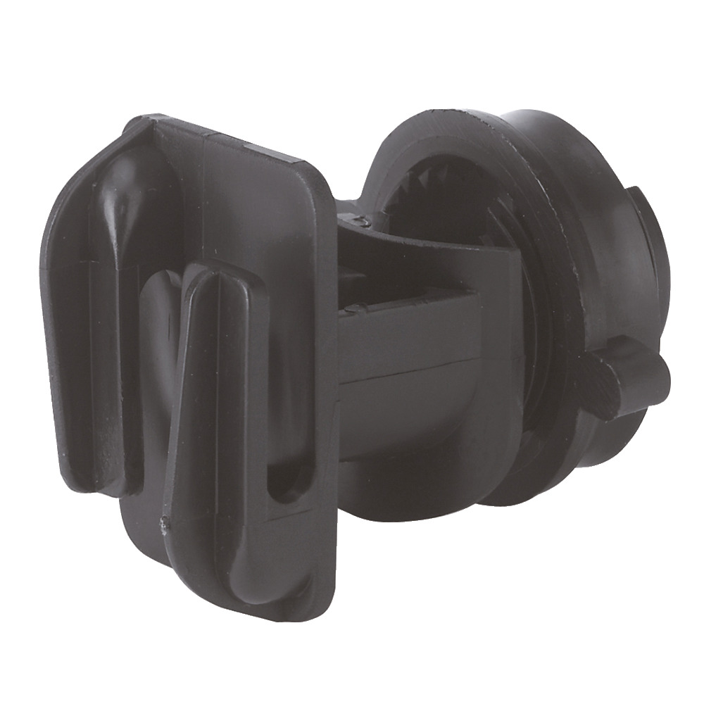 Schraubbar, schwarz, universell verwendbar, für Zaunpfähle aus Holz, Metall und jedem anderen Material bisØ 19 mm, verstellbar auf jede beliebige Drahthöhe. Hinten offen. Passend für Draht, Litze und Breitband bis 20 mm. 10 Stück/Packung