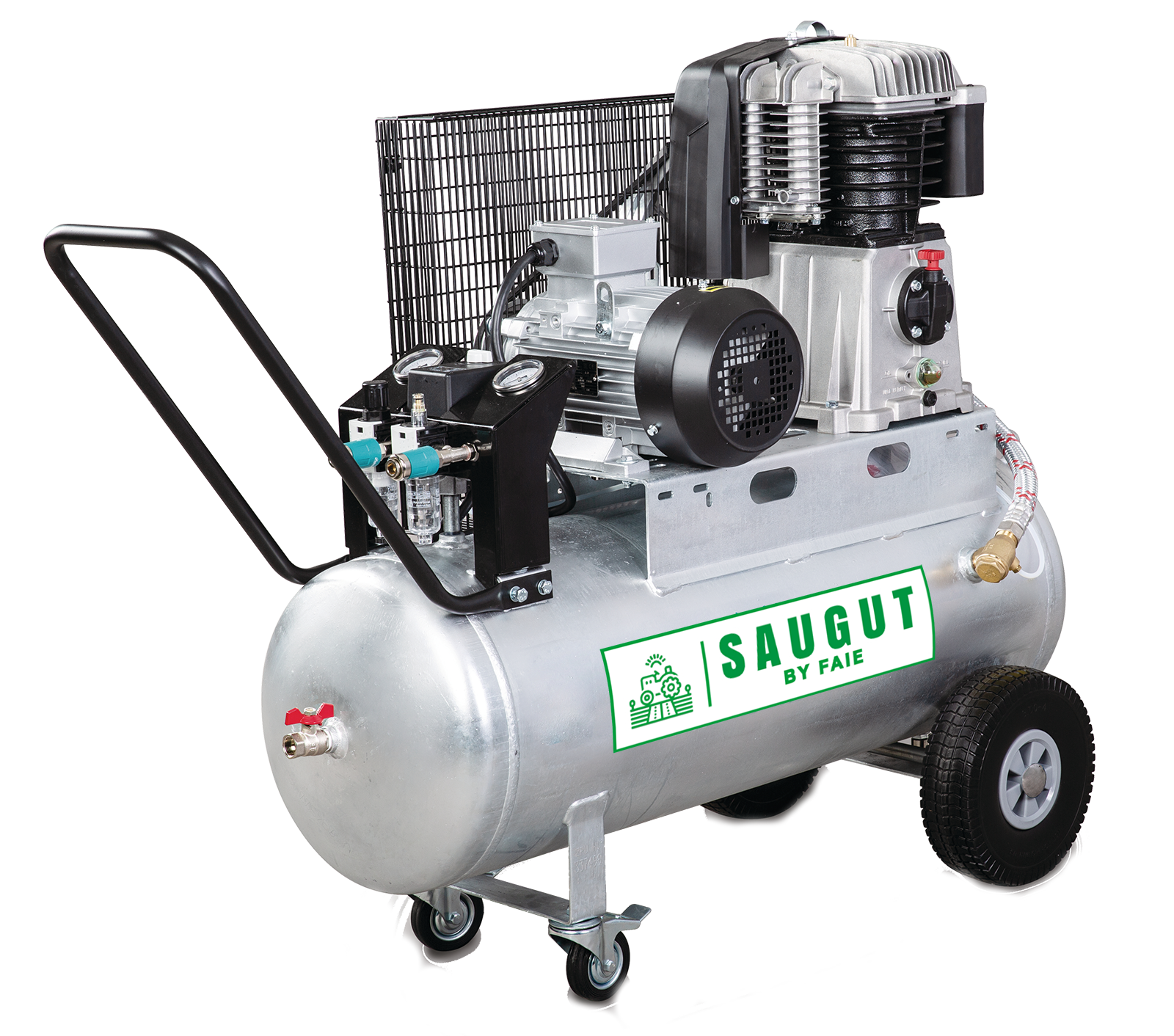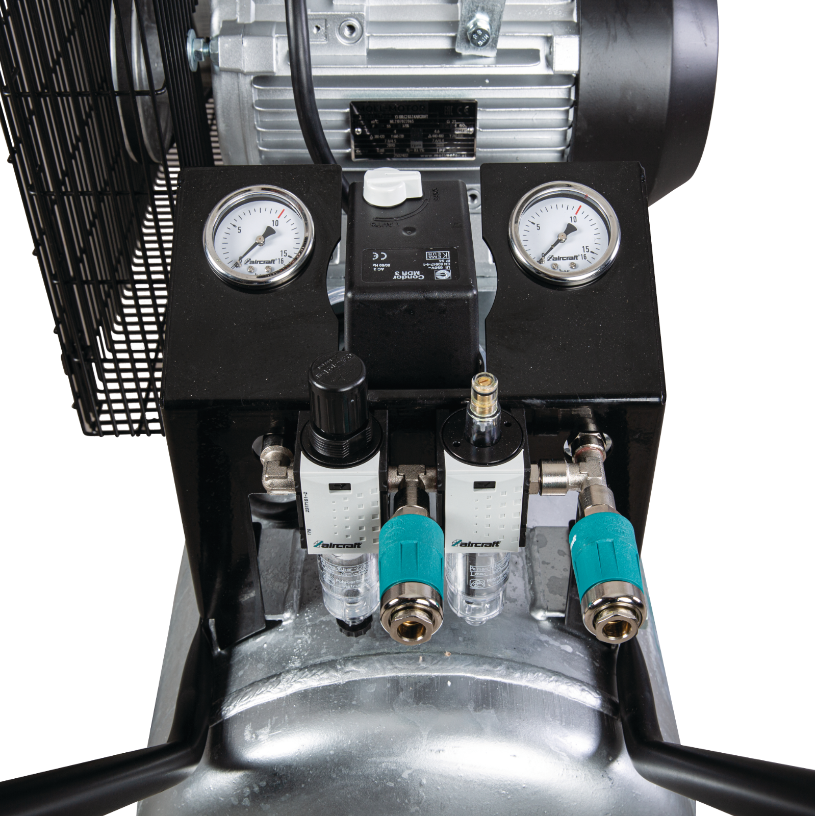 Profi - Kompressor mit 2-Zylinder und 2- stufigen Aggregat.Der Kompressor hat einen leistungsstarken 4 KW/ 5,5 PS Motor.Durch die geringe Drehzahl von nur 950 U/min ist der Verdichter auch für lange Laufzeiten hervorragend geeignet undsorgt für eine extrem lange Lebensdauer.Die hohe Ansaugleistung von bis zu 650 L/min und die Füllleistung von ca. 520 L/min (bei 6 bar) sorgt für den sicheren Betrieb anspruchsvoller Druckluftwerkzeuge.Der Kompressor hat einen leistungsstarken 4 kW/ 5,5 PS Motor mit 400 Volt und Motorschutzschalter.Der verzinkte 100 L Kessel mit Fahrwerk sorgt für eine lange Lebensdauer und einfachen Einsatz überall wo Druckluft benötigt wird.Qualitäts-Elektromotor mit hohem Anzugsmoment ist mit einem Motorschutzschalter ausgestattetAnlaufkondensator und Anlaufentlastungsventil sichern einen leichten AnlaufSerienmäßig mit Phasenwender für eine einfache manuelle Umkehrung der DrehrichtungDruckluftverdichtung über Hochleistungsaggregat HOSDas Anlaufentlastungsventil gewährleistet einen leichten und drucklosen AnlaufDas Zweizylinder-Hochleistungsaggregat aus Grauguss und die niedrige Drehzahl garantieren besonders ruhigen und vibrationsarmen Lauf und eine lange LebensdauerDies gewährleistet eine noch längere Lebensdauer durch noch weniger VerschleißHochwertiger Verdichter mit optimaler Schmierung für eine lange Lebensdauer und hohe ZuverlässigkeitAusgestattet mit hochwertigem AnsaugfilterDer Nachkühler mit großen Kühllamellen sorgt für eine niedrige Kesseleintrittstemperatur und somit für weniger Feuchtigkeit in der Druckluft, was die Druckluftwerkzeuge schontZusätzlich mit Zwischenkühler zum NachkühlerKorrosionsfreie Ventilplatten für verbesserte Wärmeableitung und Langlebigkeit des KompressorsDas große Lüfterrad und ein Kühlluftleitblech am Zylinder sorgen für optimale Kühlung des VerdichtersEin stabiler Riemengitterschutz aus Metall sorgt für optimalen Schutz der Bauteile und für eine hohe AnwendersicherheitDruckluftzuleitung in den Kessel über flexible Panzerschlauchleitung mit Hitzeschutz verhindert einen VibrationsbruchHochwertiger AntriebsriemenKraftvoller und sparsamer AntriebDer gezahnte Antriebsriemen erleichtert den Anlauf, verbessert die Laufruhe sowie die Kraftübertragung und reduziert die Leistungsaufnahme um bis zu 30%Stabiler Riemengitterschutz aus MetallBedienung am WartungsblockAusgestattet mit einem hochwertigem CONDOR-Druckschalter MDR 5 mit robuster Tastschalterfunktion für vollautomatischen Ein-AusschaltbetriebFilterdruckregler zur stufenlosen Einstellung des Arbeitsdrucks, bei gleichzeitiger Schmutz-, Öl- und KondenswasserabscheidungZwei große Manometer zeigen den Behälter- und den Arbeitsdruck an. Luftentnahme am Wartungsblock über eine Komfort-Sicherheits-Schnellkupplung. Am Wartungsblock nur feste Schraubverbindungen, keine SchlauchverbindungenZwei DruckluftentnahmestellenEine Druckluftentnahmestelle für gefilterte DruckluftEine Druckluftentnahmestelle über Direktausgang am Kessel mit KugelhahnKomfort-Sicherheits-Kupplung - Die Vorteile.Komfort-Sicherheits-Kupplungen von AIRCRAFT als erster Hersteller serienmäßig eingesetztZwei getrennte Verriegelungs-Systeme für maximale ArbeitssicherheitGefährliches Aufpeitschen der Schlauchleitung wird unterbundenKomfortabel und sicher zu transportieren und aufzustellenErgonomisch verlängerter Bügel für einen bequemen Transport in nahezu aufrechter Haltung - Belastung des Rückens durch Anheben wird vermiedenPannensichere PU-Schaum-Laufräder und stabiles Lenkfahrwerk mit Feststellbremse ermöglichen einen leichten TransportDie Feststellbremse verhindert sowohl Dreh- und Rollbewegung der Räder und gewährleistet einen optimalen Stand des KompressorsMit praktischem zweitem Transportgriff am Kessel, mit dem das Tragen des Kompressors erleichtert wirdHochwertiger Kessel mit dauerhaftem RostschutzAIRCRAFT stattet als erster Hersteller die Kompressoren der AIRPROFI Serie serienmäßig mit innen und außen feuerverzinkten Kesseln ausAuf die Kessel der AIRPROFI-Serie erhalten Sie deshalb 15 Jahre Garantie gegen Durchrostung.