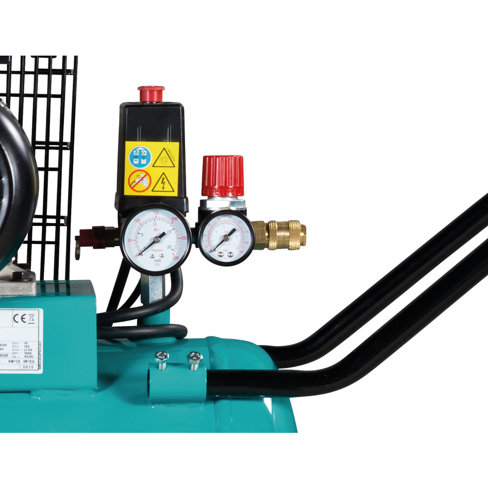 Kompakter Kompressor mit Riemenantrieb (Langsamläufer) und zwei Zylinder Hochleistungsaggregat aus Grauguss für lange Lebensdauer und werteschonende Nutzung.Optimale Kühlung des Verdichters durch großes Lüfterrad und Kühlluftleitblech am Zylinder.Qualitäts Elektromotor mit Motorschutzschalter und hohem Anzugsmoment. Kühllamellen am Nachkühler garantieren eine niedrige Eintrittstemperatur in den Behälter und sorgen so für weniger Feuchtigkeit in der Druckluft.Mit Riemenschutzgitter aus Metall, Sicherheitsventil, Kondensat Ablass Ventil, Druckmanometer und allen Sicherheitseinrichtugnen. Lieferung komplett anschlussfertig. Zusätzliche Ausstattung:Druckminderer für stufenlose Einstellung des Arbeitsdrucks, je ein Manometer für Anzeige des Behälter- und Arbeitsdrucks, Einfache Einhandkupplung, Druckschalter automatisch. Kunststoffräder hinten, Gummi Saugfüße vorne.Technische Daten: