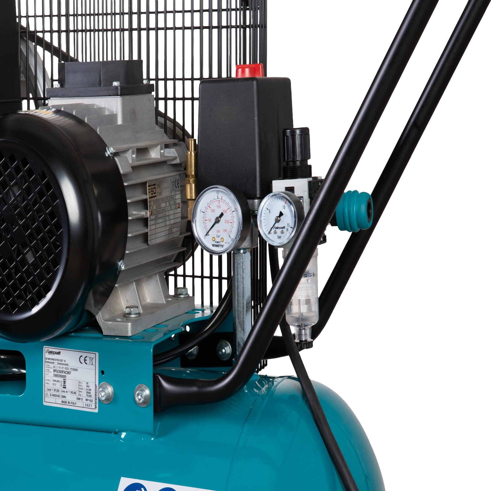 Zweizylinder-Hochleistungsaggregate aus Grauguss für eine lange LebensdauerGroßes Lüfterrad und ein Kühlluftleitblech am Zylinder für optimale Kühlung des VerdichtersQualitätselektromotor mit hohem AnzugsmomentElektromotor mit Motorschutzschalter ausgestattetNachkühler mit Kühllamellen sorgt für eine niedrige Behältereintrittstemperatur und so für weniger Feuchtigkeit in der DruckluftStabiler Riemengitterschutz aus MetallAnlaufkondensator und Anlaufentlastungsventil sichern einen leichten Anlauf bei 230 Volt-ModellenBehälterdruckmanometer „Made in Germany“Filterdruckregler mit Manometer „Made in Germany“ für geregelte und von Kondensat, Schmutz und Öl gereinigte DruckluftZehn Jahre Garantie gegen Durchrostung auf pulverbeschichteten DruckluftbehälterInklusive hochwertiger Composite-Sicherheitskupplung und hochwertigem CONDOR DruckschalterGroßer ergonomischer BügelgriffStabiles Lenkfahrwerk mit Feststellbremse in Verbindung mit großen, pannensicheren PU-Laufrädern