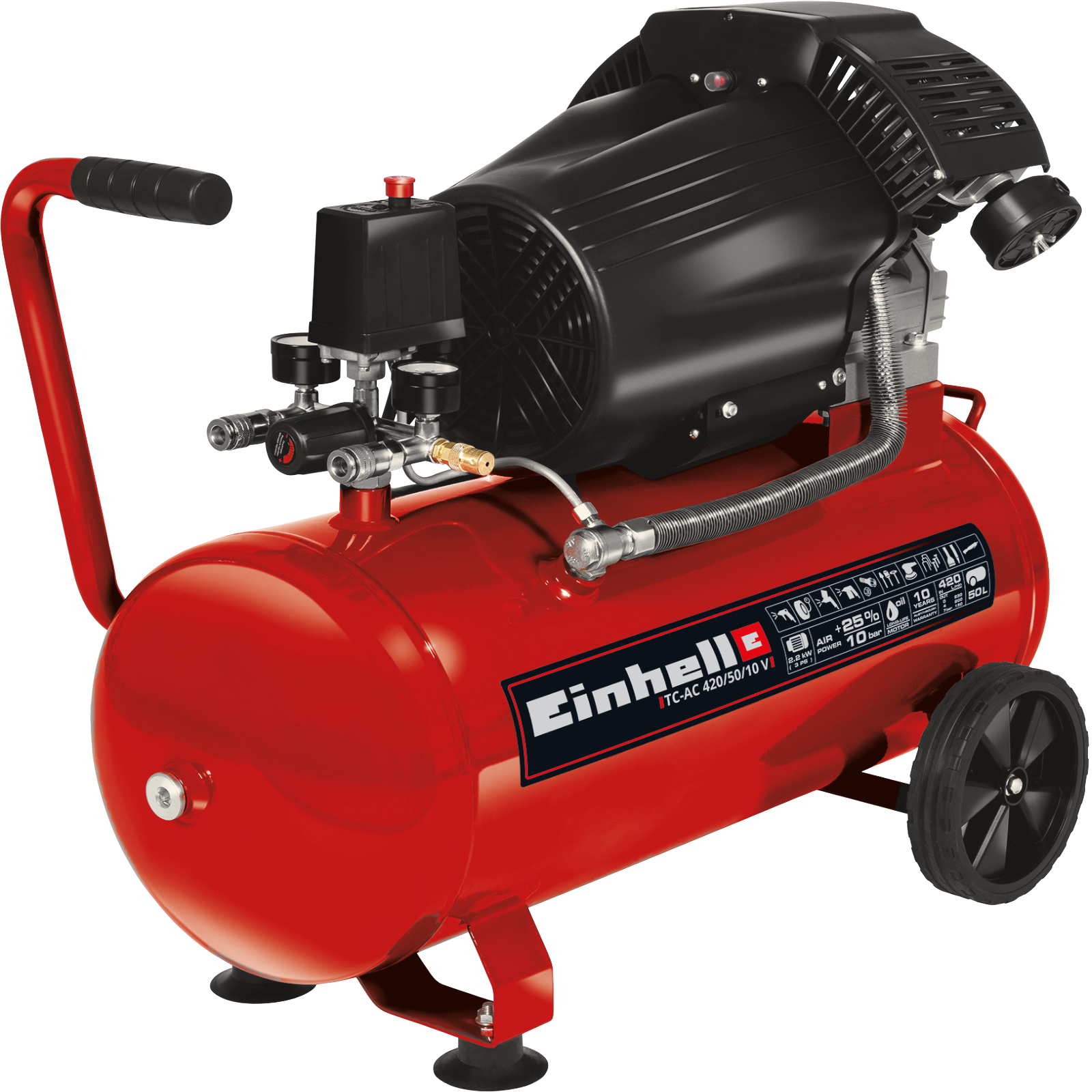 Der Einhell Kompressor TC-AC 420/50/10 V erzielt eine hohe Luftleistung durch den 2-Zylinder Verdichter,der 50l-Tank bietet ausreichend LuftreservenAusstattung:Ölschmierung sichert LanglebigkeitÖlstandkontrolle über SchauglasDer 50l-Tank bietet ausreichend LuftreservenHohe Luftleistung durch DoppelverdichtereinheitViele Anwendungen bis 10 bar regulierbar mittels DruckmindererManometer und Schnellkupplung für geregelten ArbeitsdruckManometer und Schnellkupplung für ungeregelten KesseldruckGroße Räder und Transportgriff für einen einfachen TransportVibrationsgedämpfte Standfüße sorgen für einen sicheren Stand10 Jahre Garantie gegen Durchrostung des KesselsRückschlagventil, SicherheitsventilEine Entwässerungsschraube ermöglicht die komfortable WartungTechnische Daten:Netzanschluss 220-240 V | 50 HzMax. Motorleistung 2200 W (3 PS)Motordrehzahl 2850 min^1- Pumpendrehzahl 2850 min^1- Ansaugleistung 420 L/minAbgabeleistung bei 0 bar 245 L/minAbgabeleistung bei 4 bar 200 L/minAbgabeleistung bei 7 bar 150 L/minMax. Betriebsdruck 10 barKesselinhalt 50 LZylinderzahl 2 STKSchalldruckpegel LpA 73.4 dB (A)Schallleistungspegel LwA 97 dB (A)