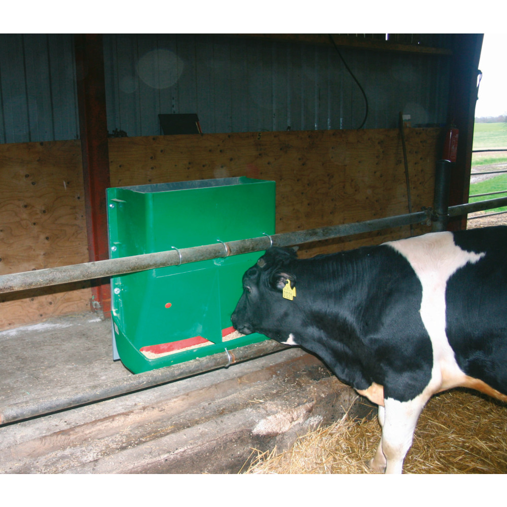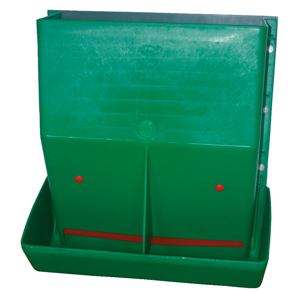 Vielseitig einsetzbarer Automat, z.B. für die Bullenmast oder Kälberaufzucht. Die Trennwand ermöglicht zwei Tieren gleichzeitig und ungestört zu fressen. Hygienisch, weil die Formgebung den Tieren eine komplette Leerung des Troges erlaubt. Einfach zu montieren - auch aufgrund des geringen Gewichtes. Die Futtermenge wird durch einen Schieber im Inneren des Behälters eingestellt. BxHxT: 75 x 80 x 38,5 cm