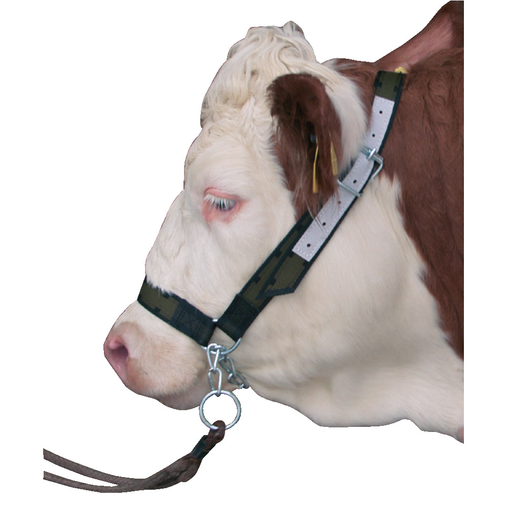 Kuhhalfter aus hautfreundlichem Material, mit verstellbarem Kopfband und festziehbarer Kinnkette für kontrolliertes Führen des Tieres. Das Halfter ist lederverstärkt, mit äußerst stabilen Beschlägen. Olivgrün mit Zinnenmuster. Top-Qualität für höchste Beanspruchung, made in Germany!