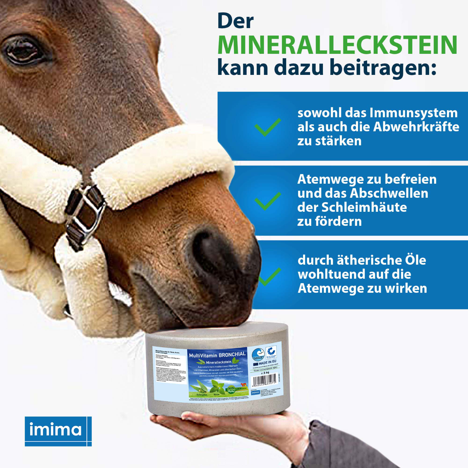 Hier kann der Mineralleckstein MultiVitamin BRONCHIAL mit seiner speziellen Wirkstoffkombination helfen. Die ätherischen Öle aus Minze und Eukalyptus können schleimlösend wirken, für Atem-Erleichterung sorgen und damit das Wohlbefinden steigern. Durch die reichhaltigen Mineralien, Spurenelemente und Vitamine wird das Pferd von innen heraus gestärkt. Damit ist MultiVitamin BRONCHIAL ideal zur natürlichen Unterstützung der Atemwegsfunktionen und des Allgemeinzustandes.