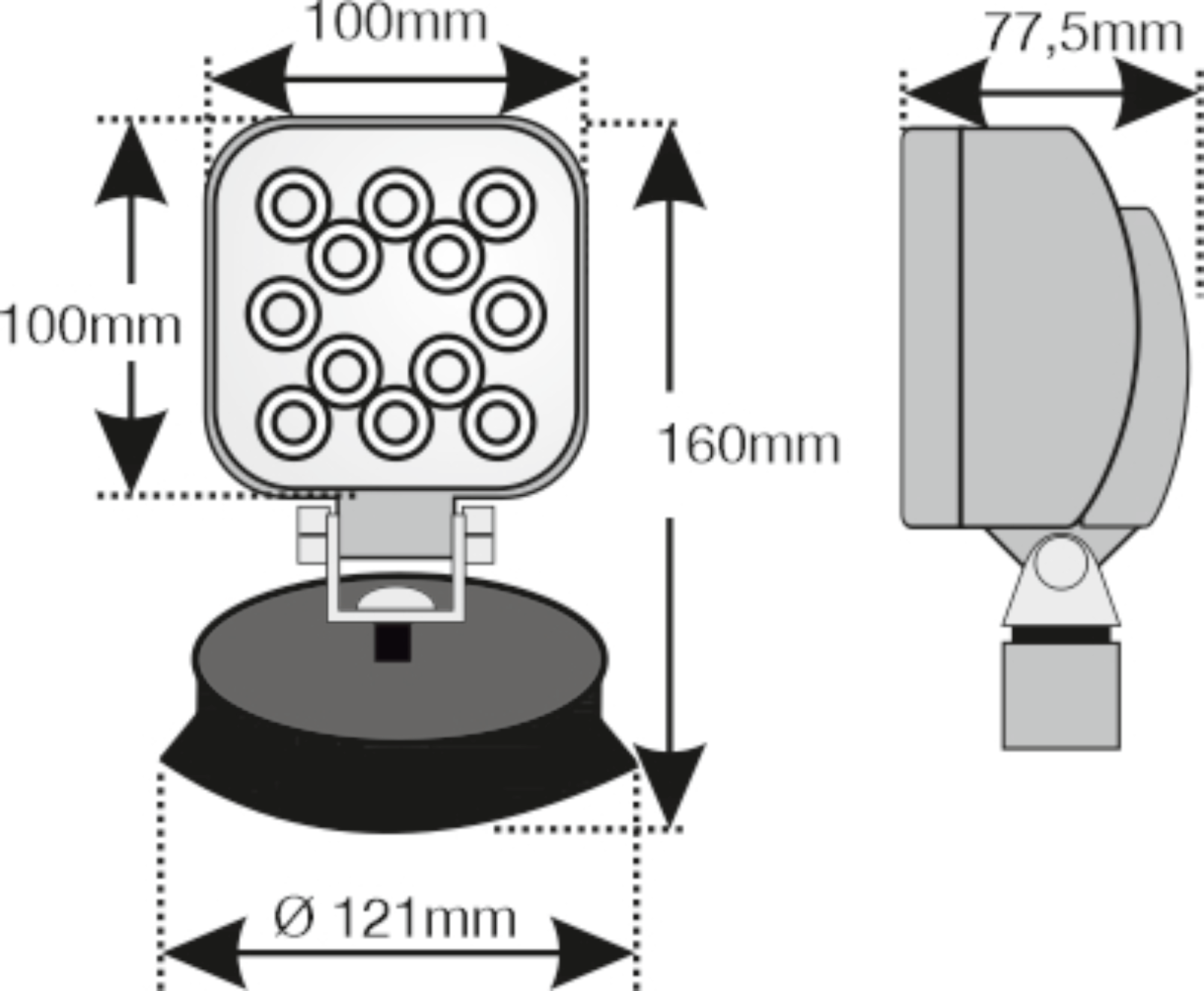 LED Arbeitsscheinwerfer mit Magnetfuß – flexibel, stark, wetterfestDieser LED Arbeitsscheinwerfer mit 12 OSRAM-LEDs sorgt für zuverlässige Ausleuchtung bei 12–24 V.Der integrierte Magnetfuß ermöglicht eine schnelle, werkzeuglose Befestigung,ideal für wechselnde Einsatzorte an Landmaschinen, Anhängern oder im Werkstattbereich.Das Spiralkabel mit Zigarettenanzünderstecker ist flexibel von 2.700 bis 7.500 mm ausziehbar und bietet große Bewegungsfreiheit.Der vollständig vergossene Leuchtkörper und das robuste Kunststoffgehäuse schützen zuverlässig vor Feuchtigkeit und Schmutz, IP68.Stromaufnahme: 1,5 A bei 12 V / 0,8 A bei 24 V. E-geprüft und EMC funkentstört – für störungsfreien Betrieb.Perfekt für alle, die eine mobile und wetterfeste Lichtlösung suchen.