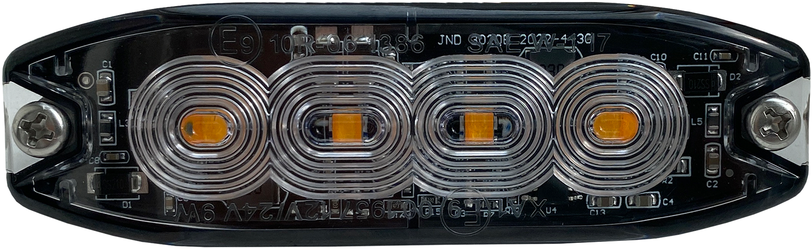 4 LED Front- Heckblitzer orange, 9 W, IP 67, ECE R65, Einfachblitz, Doppelblitz, ECE R10, SAE J595 Klasse 1synchronisierbar und kombinierbar bis 4 Stck., mit Memory Funktion, 12V/24V,zum Aufkleben oder Anschrauben!Maße ca. LxBxH: 100x30x10mmE9 10R-06 1386,SAE W117,X A1 E9 00.1957