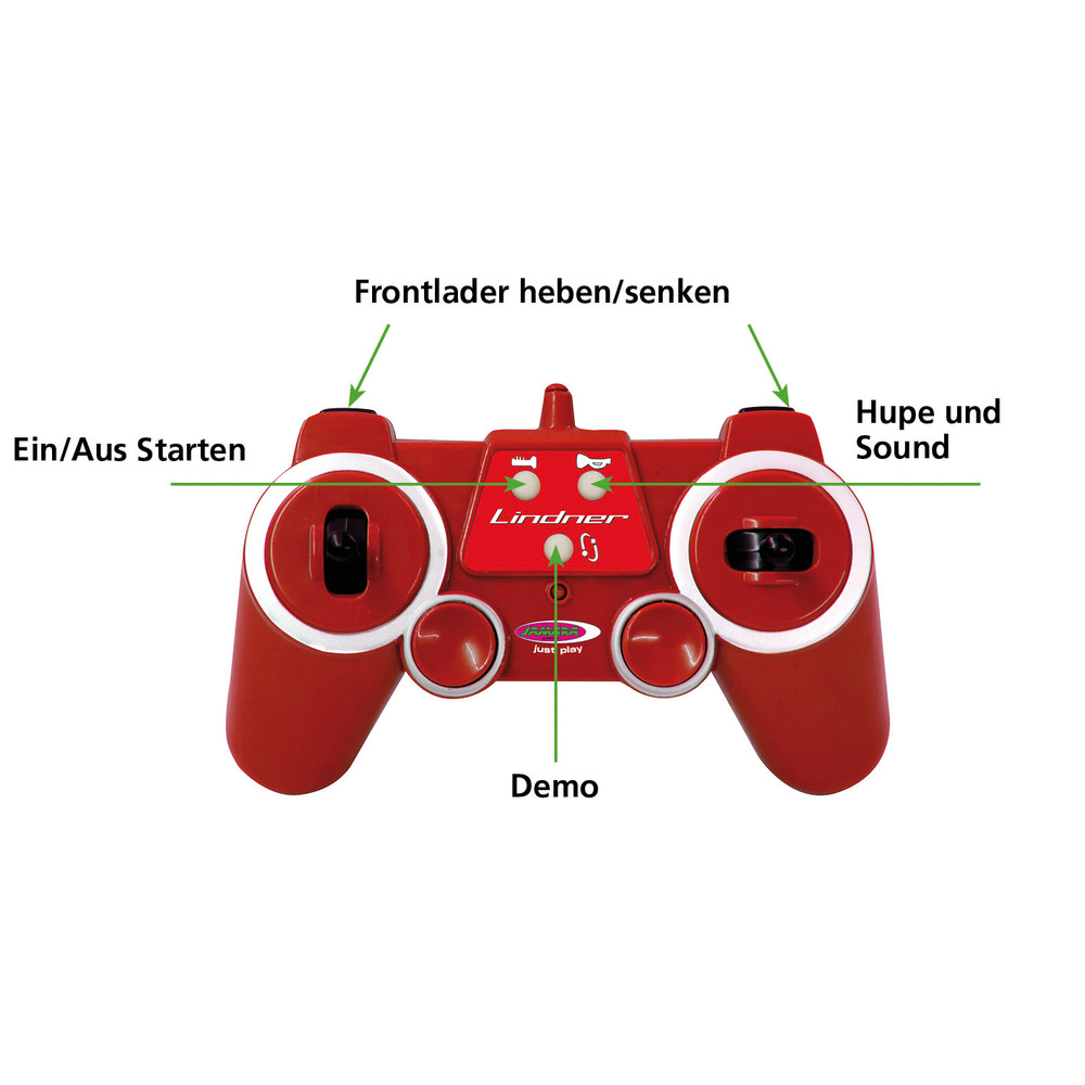 Highlights:• 2,4 GHz für Mehrspielerbetrieb• Realistischer Motorsound, abschaltbar• Schaufel heben/senken/abkippen• Hupe• Standby-Modus• Rückfahrwarnsound• 2 Radantrieb• Blinker• Helle LED‘s vorne• Profi lierte Gummireifen• Anschlussbuchse für AnbaugeräteFahrzeit ca. 30 min.Ab 8 JahrenFunktionen:• Vorwärts/Rückwärts• Links/Rechts• Stopp