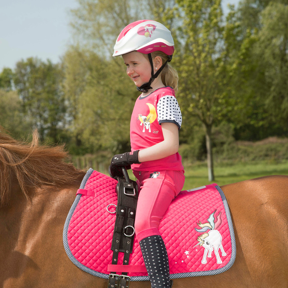 Longiergurt für Ponys bzw. Shettys, mit lederüberzogenem Handgriff für das sichere Longieren mit Kindern bei optimalem Körperkontakt ohne Sattel. Mit Rechteckringen in die Bügelriemen eingeschnallt werden können, 6 Ringe zum Befestigen von Hilfszügeln. Gebrauchslänge: 1,20m - 1,70m