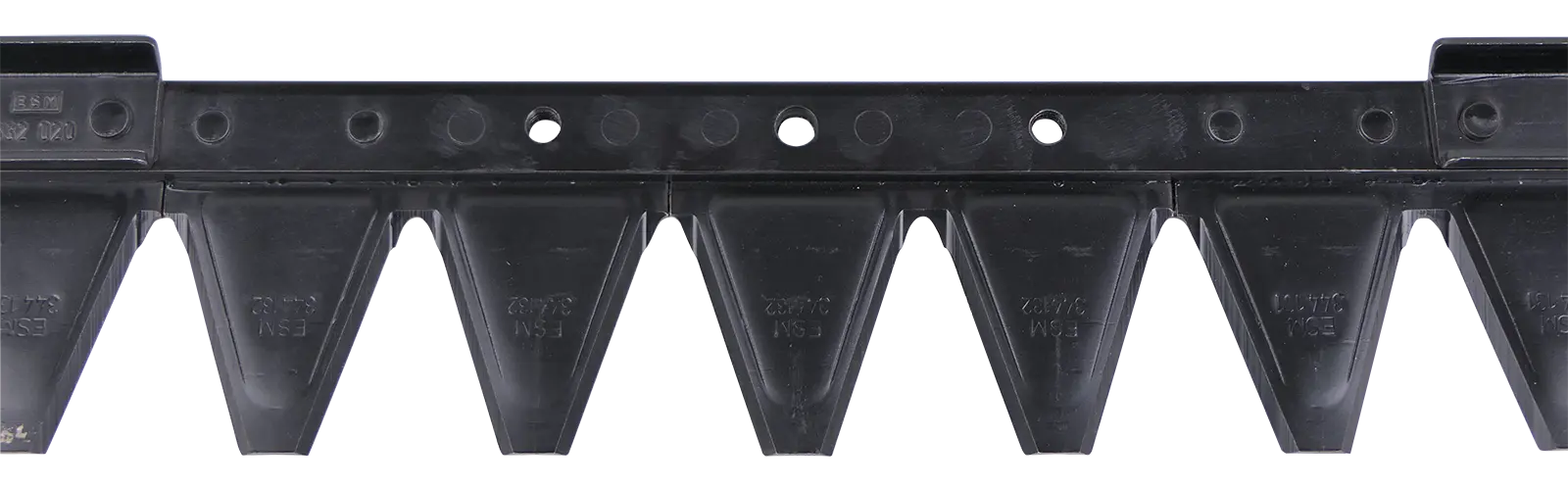 Mähmesser mit 21 Klingen passend zu ESM Universalbalken SC mit aufklappbaren Messerhalter. Der Messerkopf wird mit 2 M8 Schrauben im Abstand von 101,6 mm auf dem Messer befestigt. In der Mitte der beiden M8 Gewindebohrungen ist eine Bohrung mit Ø 8,1 mm zur Aufnahme des Zentrierbolzens auf dem Messerkopf. Auf dem Mähmesser sind 4 Stk. Führungsleisten angebracht. Die Führungsleisten sind positioniert über 2./3., 7./8., 14./15. und 19./20. Klinge.