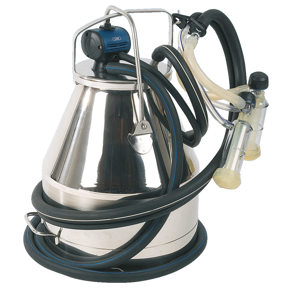 Aus Edelstahl, komplett. Bestehend aus Pulsator L02 Air, Takt 60:40, 90 Schläge/min, Edelstahleimer 25 L, Edelstahldeckel, 1 Melkzeug, Milch- und Luftschläuche.